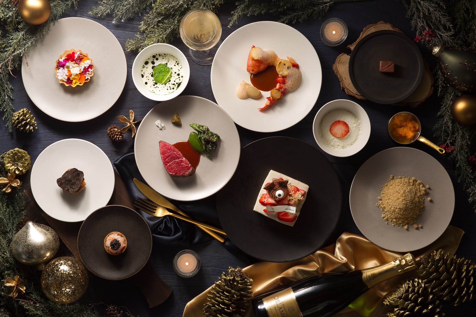 キャビアを乗せ柚子の香りを効かせた薩摩赤海老のタルト、黒トリュフをふんだんに用いたクラッシュポテトなど、香りも楽しめるアミューズから始まる当コースは、エディブルフラワーを敷き詰めたタルトレットやパウダー状にしたフォアグラなど、ひと皿ひと皿に驚きと楽しみが凝縮された内容となっています。メインはオマールソテーと和牛フィレステーキをご用意。デザートのダブルチーズケーキに至るまで、クリスマスの大切なシーンにふさわしいメニューに仕上げました。