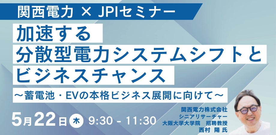 JPI(日本計画研究所)は、関西電力株式会社 シニアリサーチャー 西村 陽 氏を招聘し、加速する分散型電力システムシフトとビジネスチャンスについて詳説いただくセミナーを開催します。