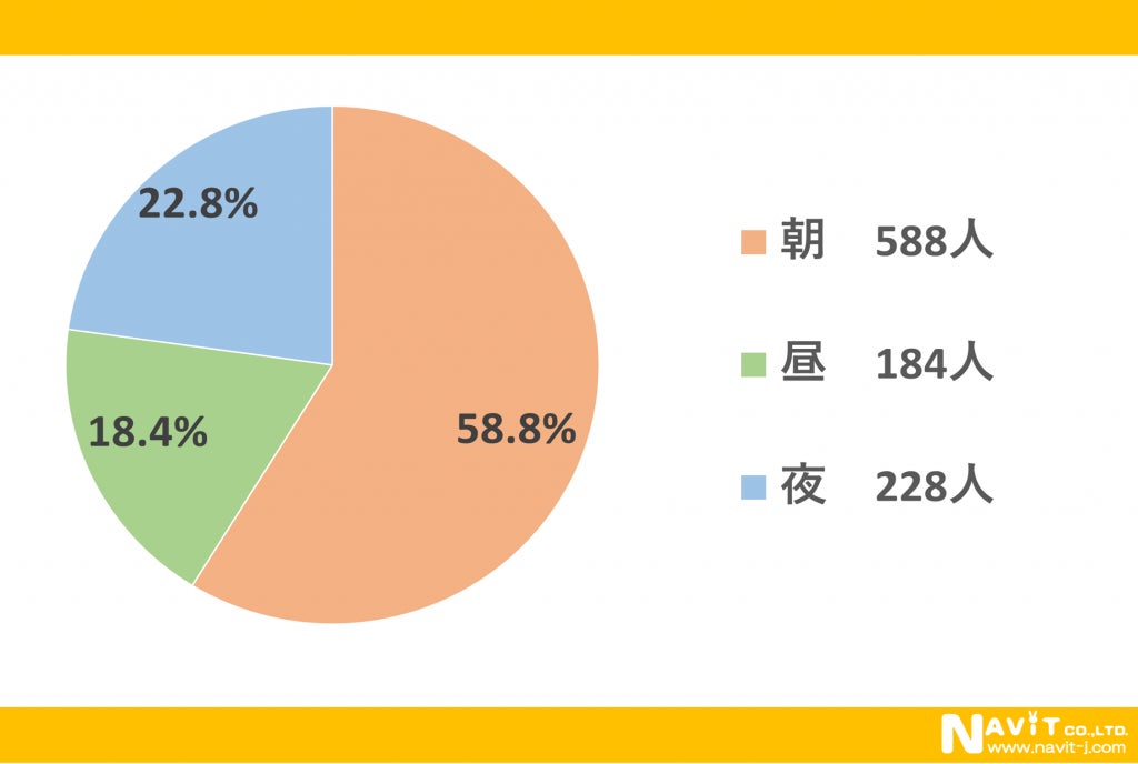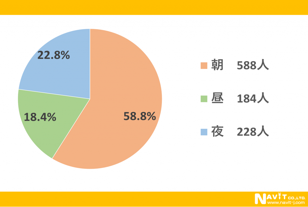 ヨーグルトを食べる時間は「朝」という人が58.5%、「夜」という人が22.8%、「昼」という人が18.4%という結果になりました。やはり朝食でヨーグルトを食べるという人が多いようです。CMなどを見ていても朝食べているような印象が強いです。