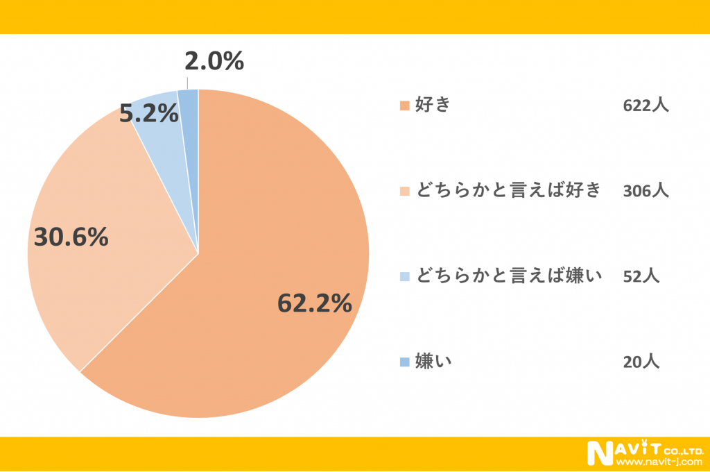 ヨーグルトが好きですか?というアンケートに対して「好き」と回答された人が62.2%もいらっしゃいます。また「どちらかと言えば好き」と回答された人も30.6%で全体の92.8%もの人がヨーグルトが好きなようです。個人的な意見になりますが、発酵食品は好き嫌いが分かれるイメージが強いので、こんなに多くの方がヨーグルトに対して好意的な評価をしているのは少し意外でした。