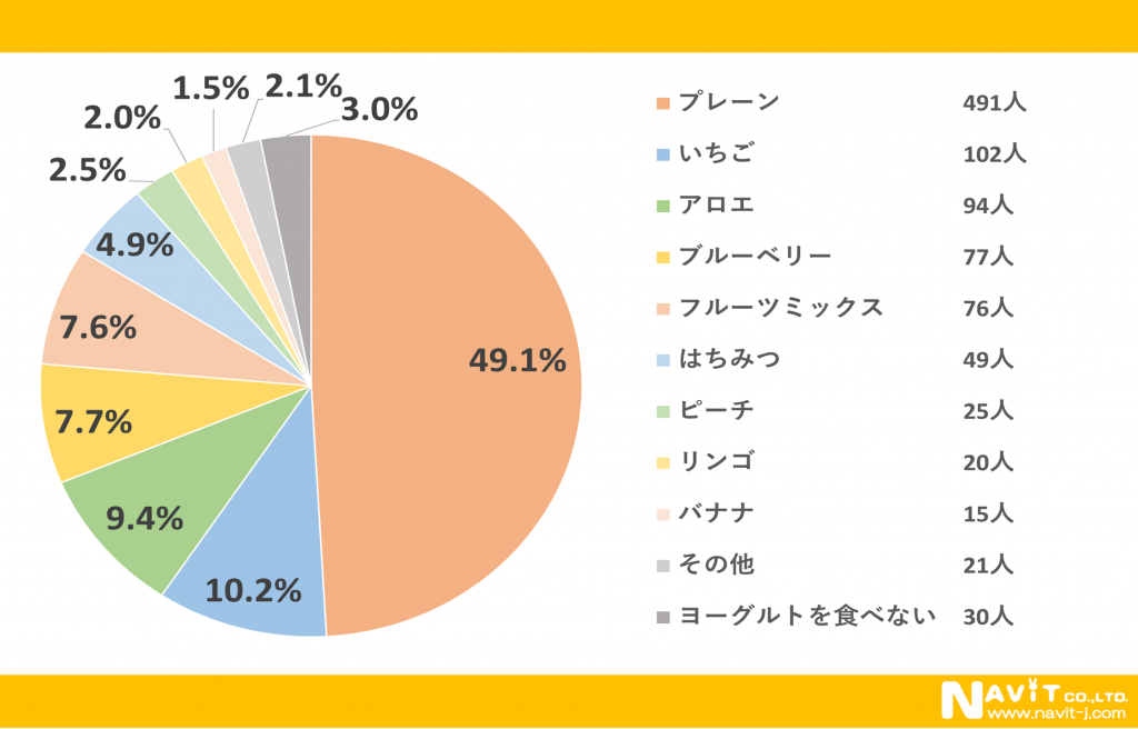 ヨーグルトの味についてのアンケートでは、圧倒的に「プレーン」が人気で49.1%でした。2位と3位は大きな差はなく「いちご」10.2%、「アロエ」9.4%という結果になりました。