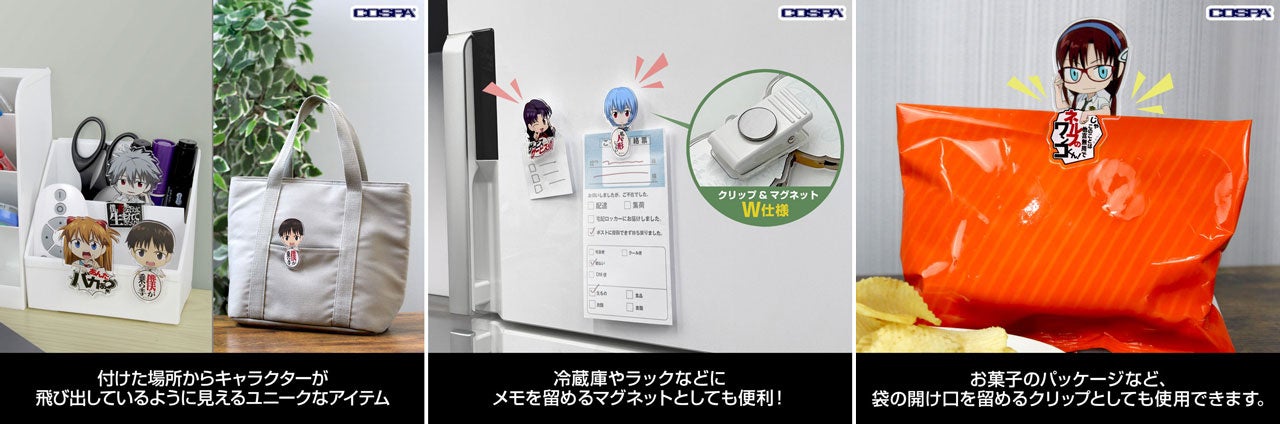 葛城ミサト「サービスサービスぅ!」セリフアクリルスタンド、アスカ「あんたバカぁ?」セリフアクリルスタンドをはじめ、Tシャツやジップパーカー、シンジ/レイ/アスカたちがピョコッと顔を出すユニークなアクセサリー「アクリルピョコッテ」など、COSPA(コスパ)からずらっとラインナップいたします。