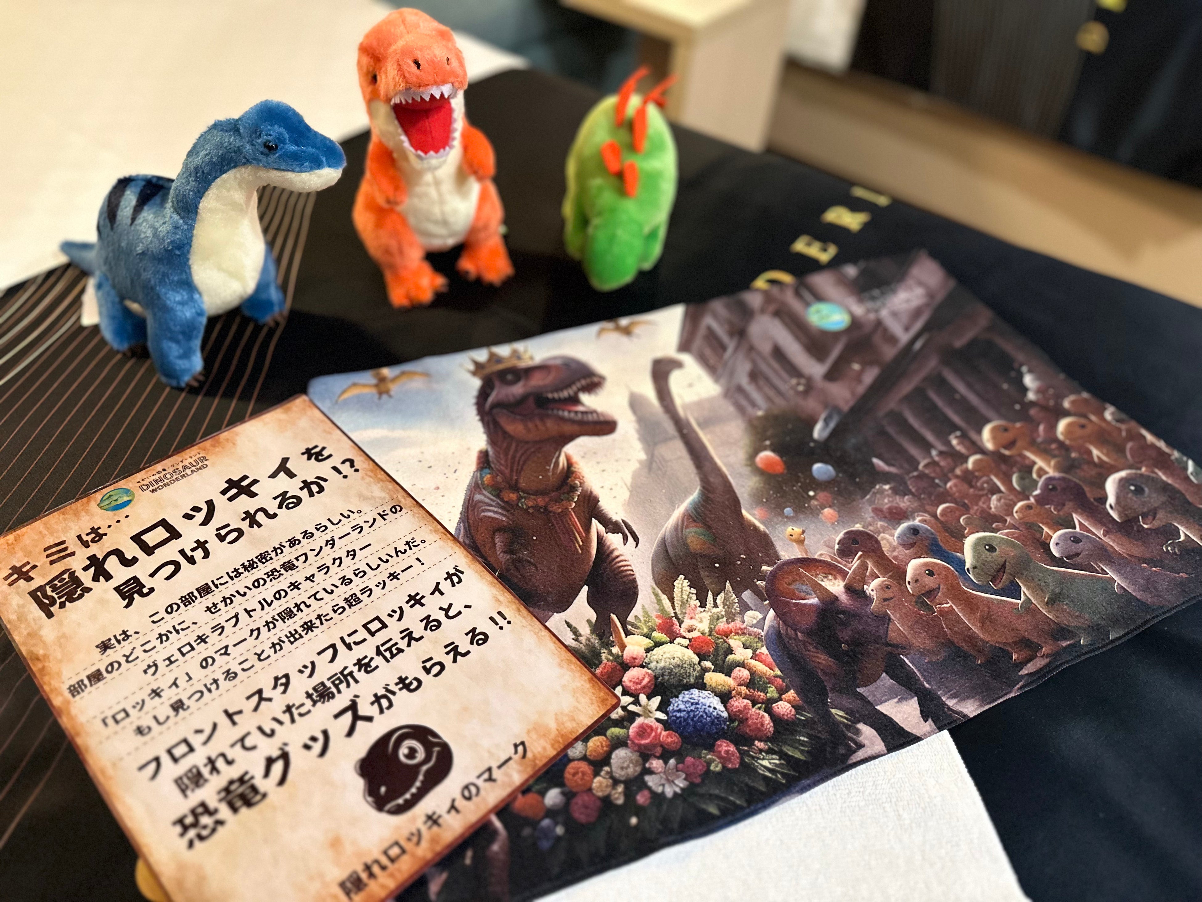 「せかいの恐竜・ワンダーランド」とコラボレーションした「恐竜ワンダールーム」は、変なホテル大阪 なんば、変なホテルプレミア 京都駅八条口前にて昨年より発売し、大変ご好評いただいていることから、3軒目の展開となります。変なホテル舞浜 東京ベイの「恐竜ワンダールーム」は、ミステリアスな異次元空間をテーマに客室をデザインしました。せかいの恐竜・ワンダーランドの人気キャラクターであるヴェロキラプトルの「ロッキィ」を隠しキャラとして客室内に装飾し、見つけていただいたお客様には、ホテルオリジナルデザインのコラボタオルをプレゼントします。また、ご宿泊のお客様には恐竜グッズのお土産付きです。価格は、朝食付き 27,300 円~、素泊まり23,300 円~(いずれも 1 室 1 泊、税サ込)