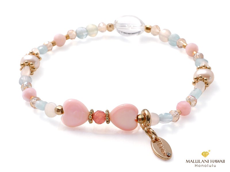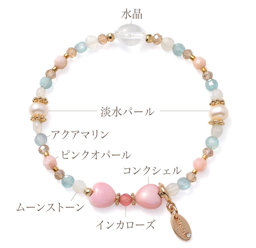 ブレスレットには、アクアマリンやムーンストーン、ピンクオパールなど、愛と幸福をもたらすと伝えられる石をセレクト。