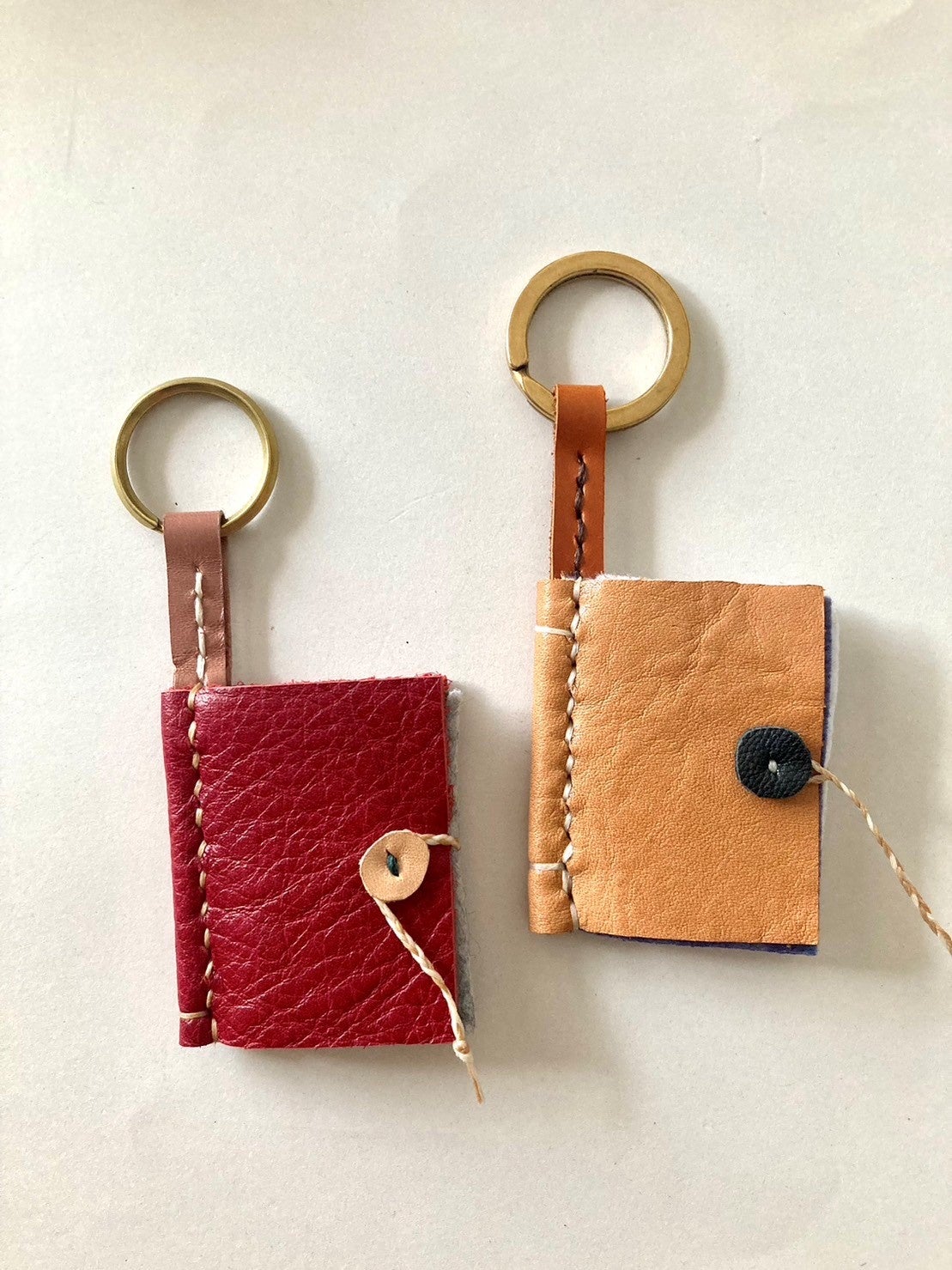 本の形をした革のキーホルダーを作ります。中はフェルトの袋になっていて、コイン、常備薬、アクセサリー、お守りなどが入る小物入れとして使えます。