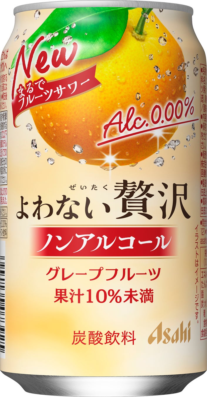 「よわない贅沢」は、アルコール分0.00%でありながら、まるで果実をそのまま搾ったフルーツサワーのような味わいが楽しめるノンアルコールカクテルテイスト飲料です。苦みと甘みのバランスが良い味わいが特長の「グレープフルーツ」と、芳醇な香りとまろやかな甘み・コクが特長の「桃」の2フレーバーを展開します。パッケージは果実のイラストで、素材のおいしさを表現しています。「まるでフルーツサワー」と「ノンアルコール」のアイコンは、酔わずにフルーツサワーのような味わいが楽しめる魅力を訴求しています。