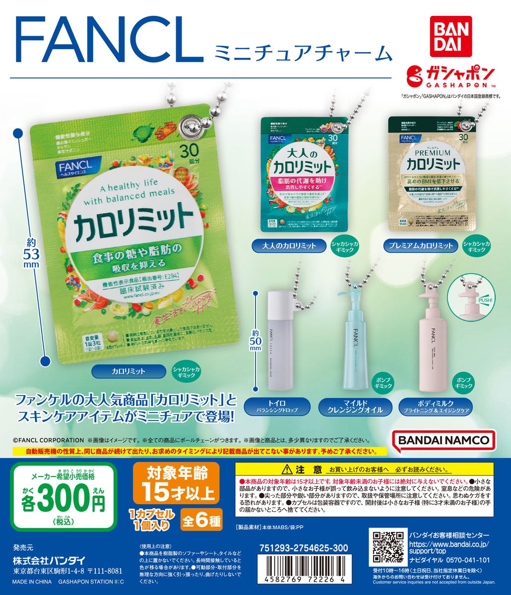 当社が展開する人気製品「カロリミット」や「マイルドクレンジング オイル」などのパッケージをそのまま再現した「ファンケル ミニチュアチャーム」(1回300円、全6種)を、2025年2月第3週から順次、全国のガシャポンバンダイオフィシャルショップ、玩具売り場・量販店・家電店などに設置されたカプセル自販機シリーズにて発売します。