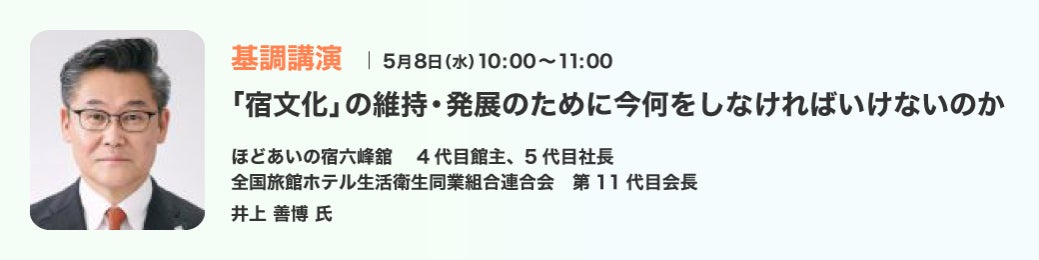 全国旅館ホテル生活衛生同業組合連合会・会長 井上氏を迎え、「宿文化」の本質や宿泊観光業の課題についてお話いただきます。六峰館の歴史を振り返りながら、宿泊観光業を維持・発展させていくにあたり何が課題になっているのか、その課題に対して全旅連として何を行っているのか、講演いただきます。
