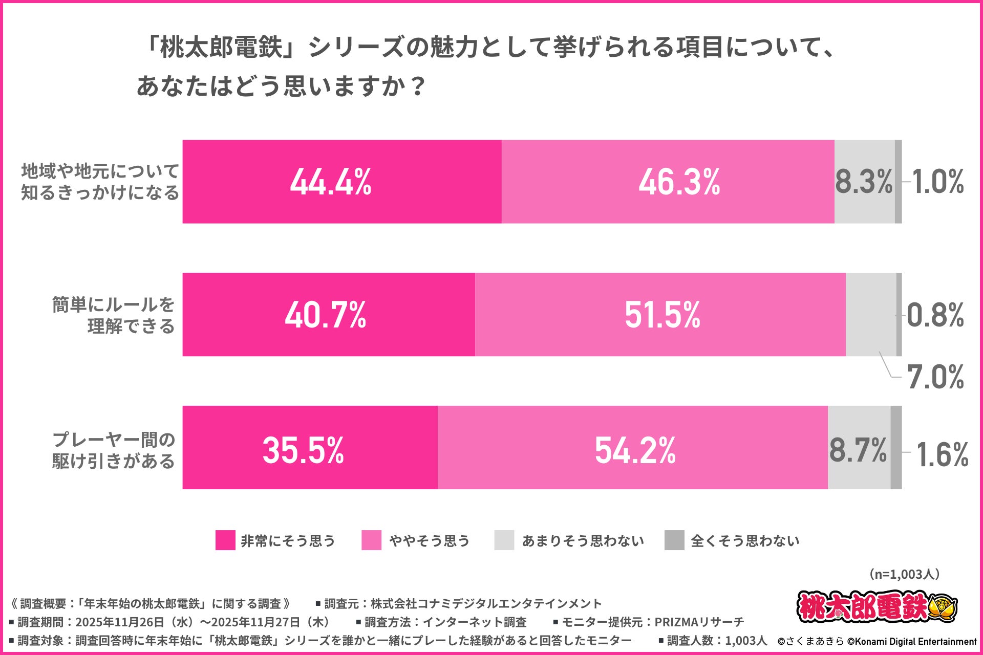年末年始に「桃太郎電鉄」をプレーしたことがある全国1,003名への調査から、家族同士の会話が生まれるゲーム設計であることと、幅広い世代で楽しんでいただけていることがデータとしても確認されました。