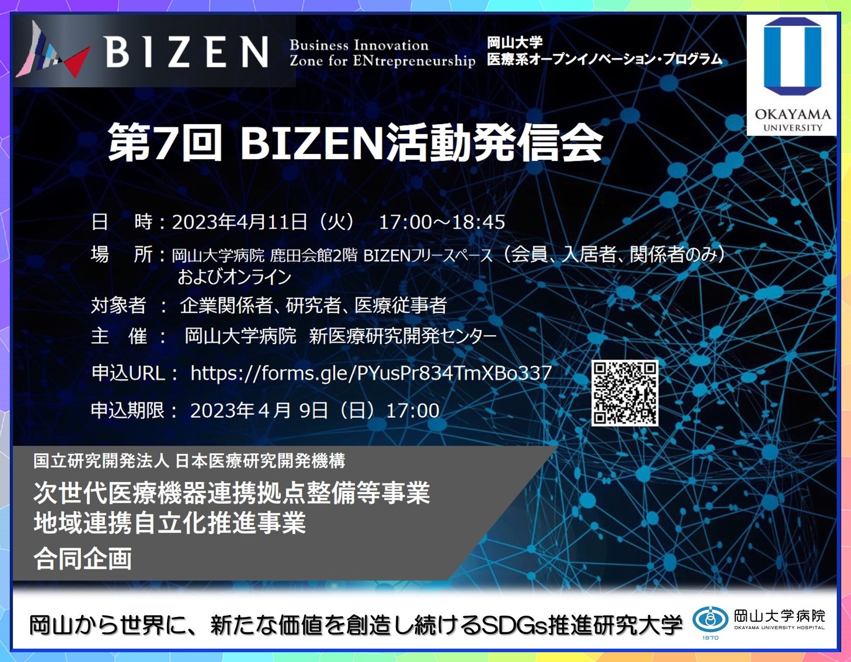 【岡山大学】岡山大学病院 医療系オープンイノベーション・プログラム「第7回BIZEN活動発信会」〔4/11 火,オンライン〕