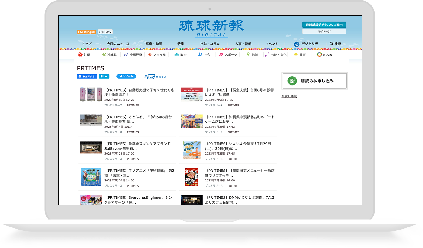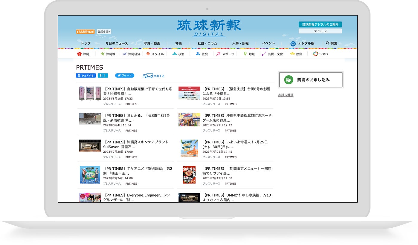 琉球新報社とプレスリリース配信サービス「PR TIMES」のコンテンツ連携により、琉球新報社のニュースサイト「琉球新報DIGITAL」へ沖縄県の新規発表にあたるプレスリリースが掲載されます。
