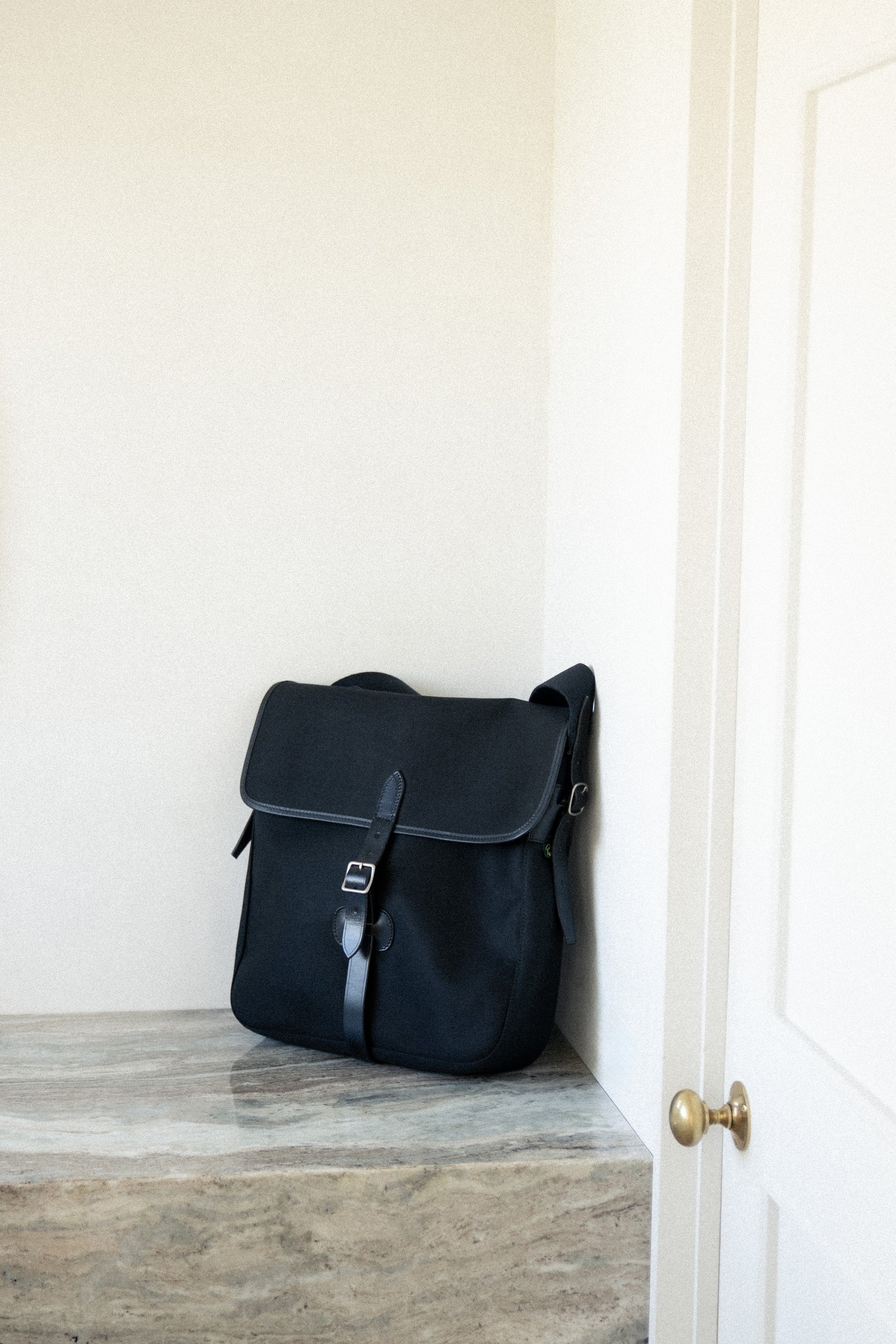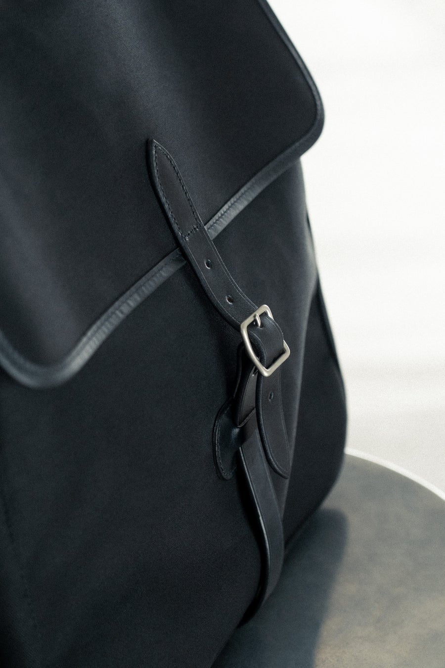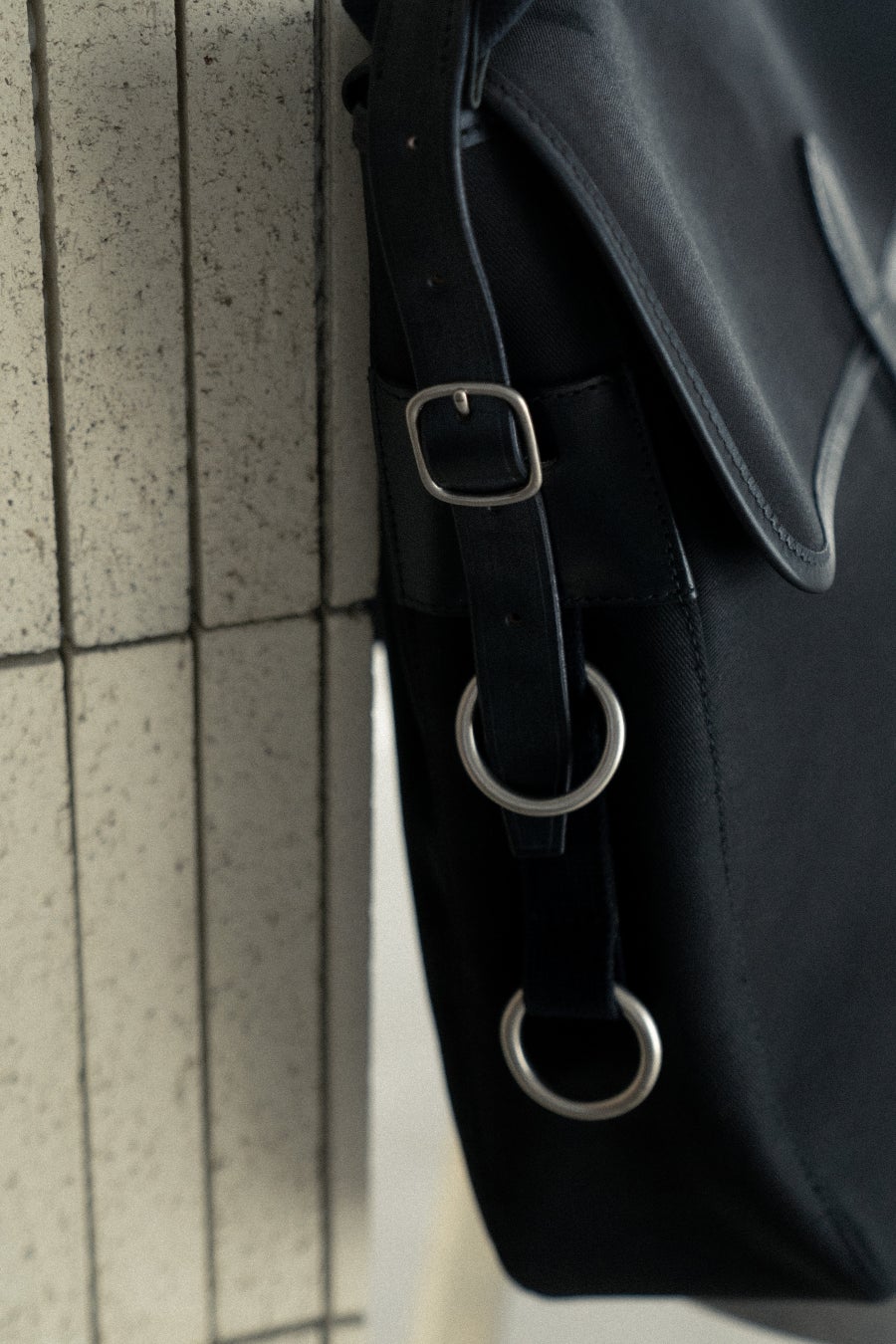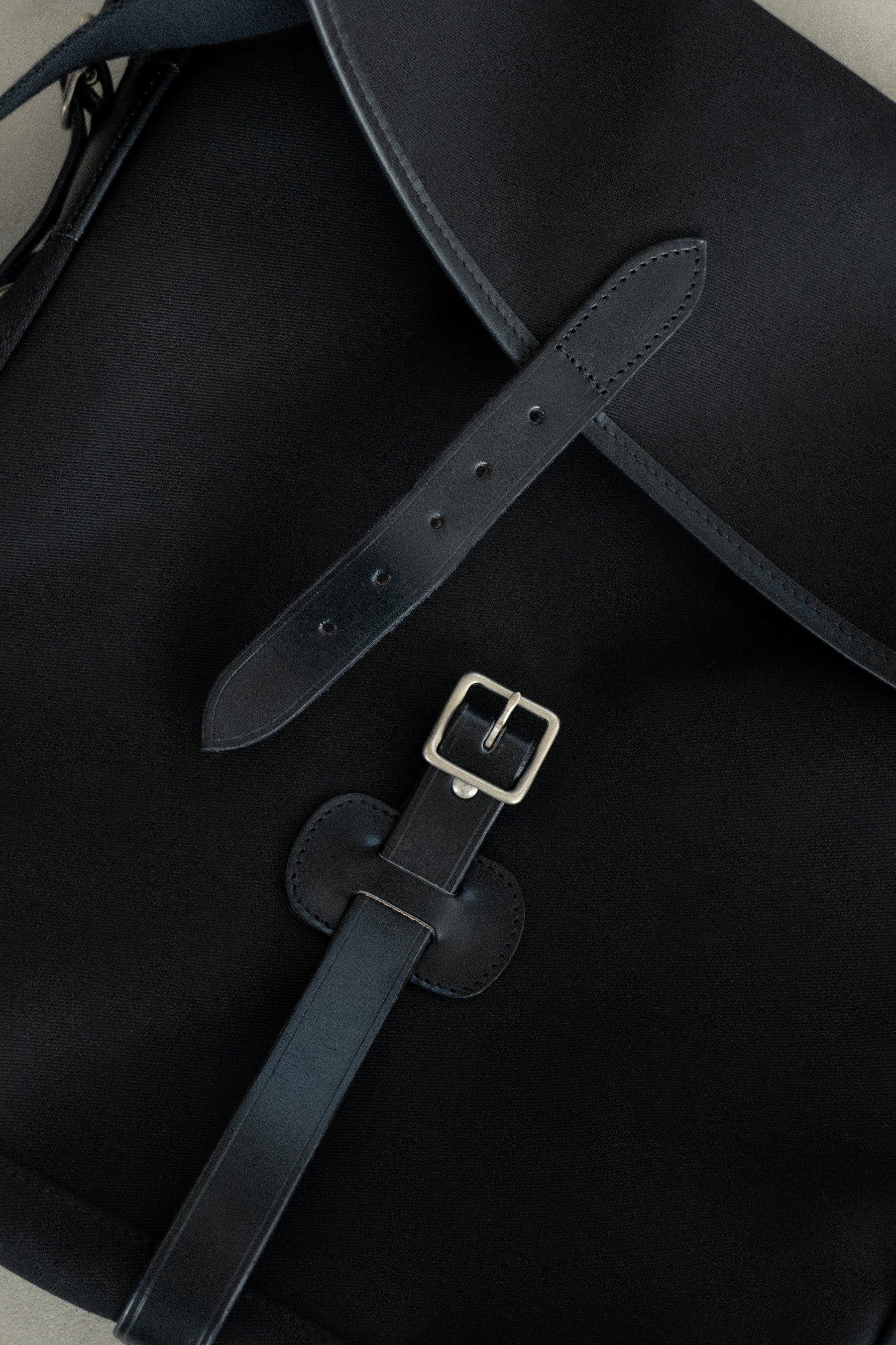 上記をベースにフロントベルトをシンプルに太めの1本に変更し、また、バッグの入り口の雨よけをなくしレコードの出し入れをスムーズに、フロントのメッシュポケットも外し、よりシンプルに仕上げ、パーツも通常真鍮のゴールドのところ、艶なしのシルバー色に変更。