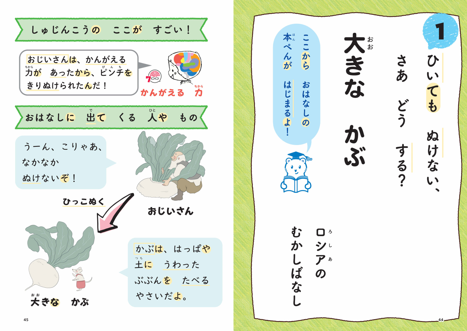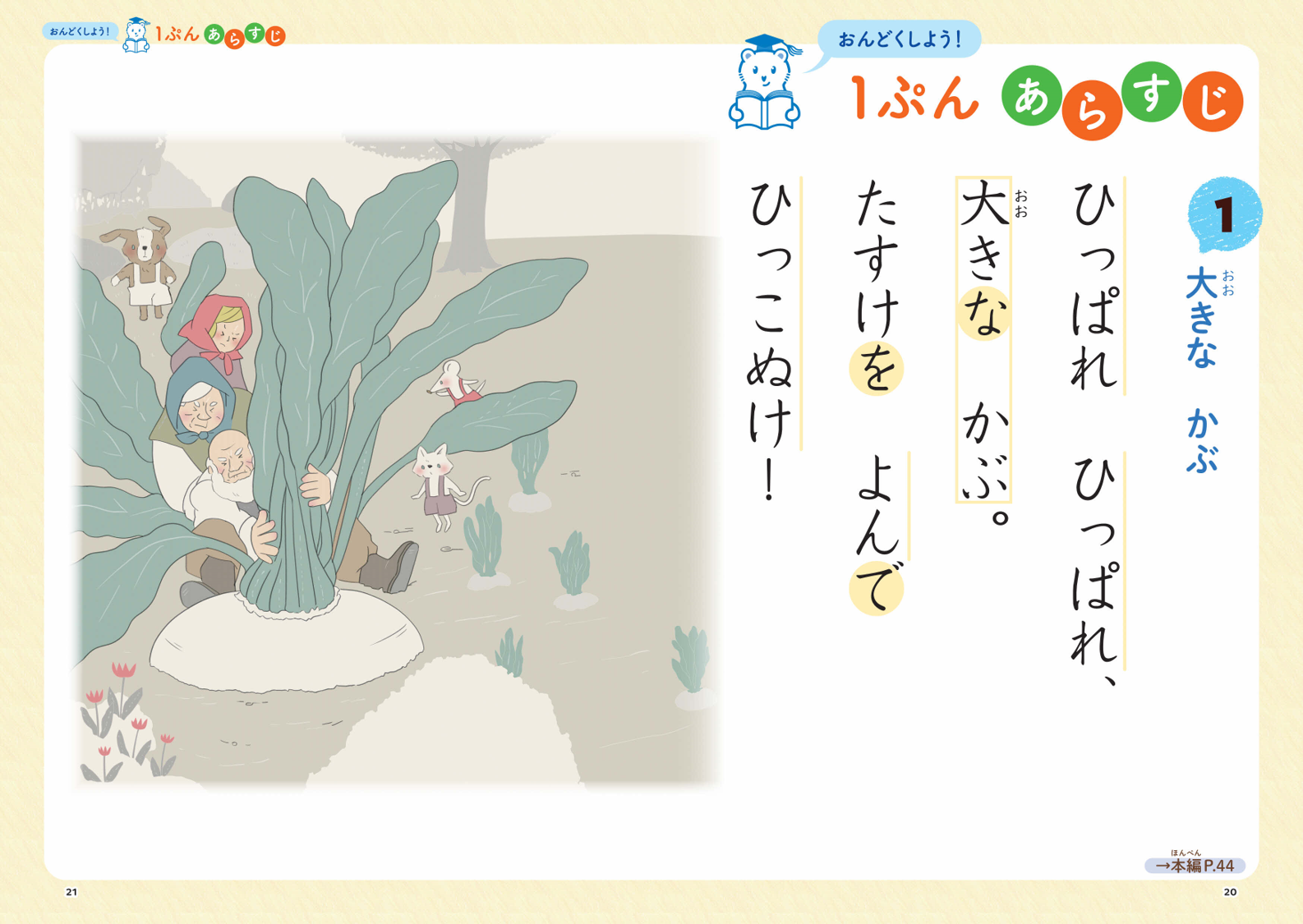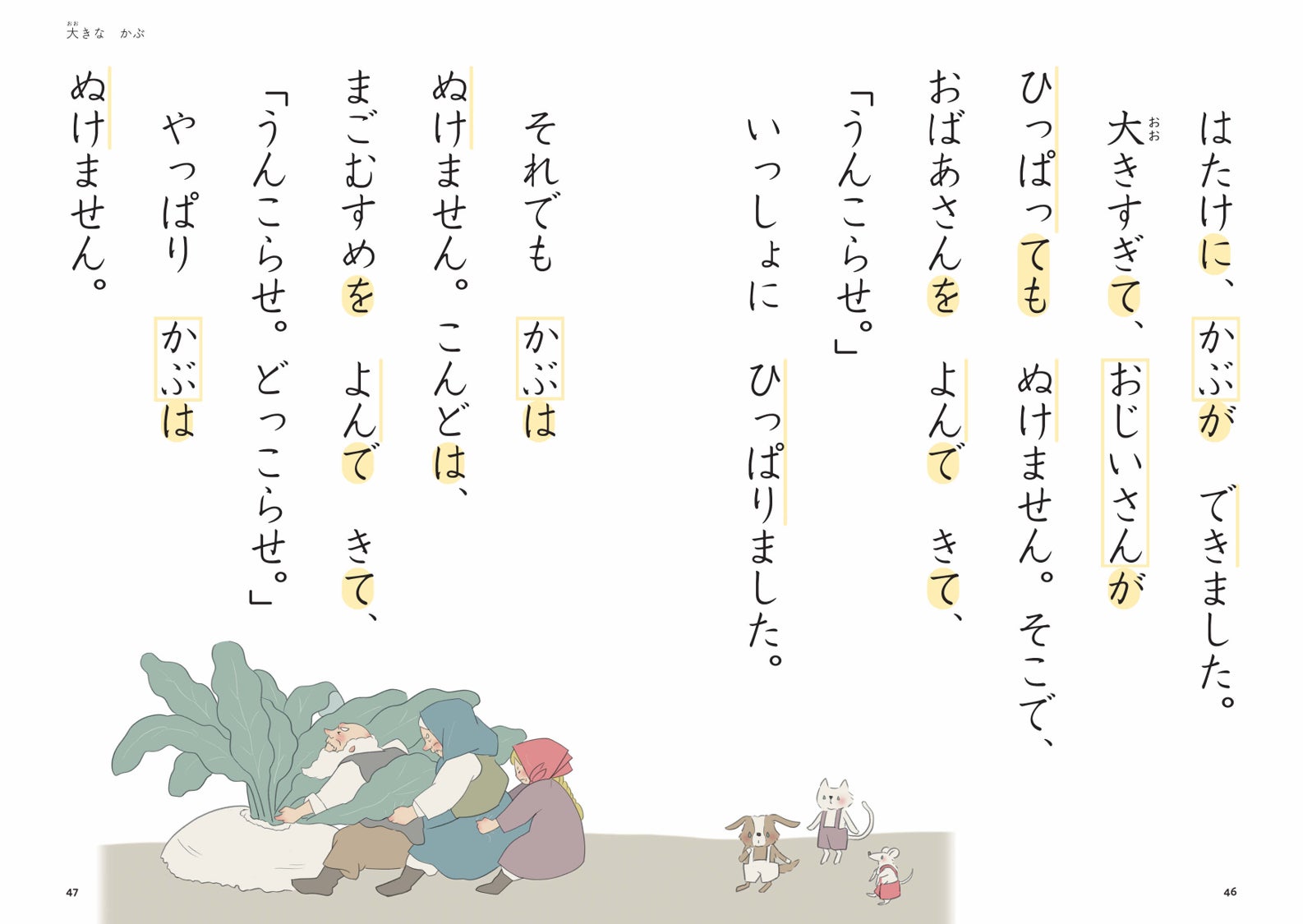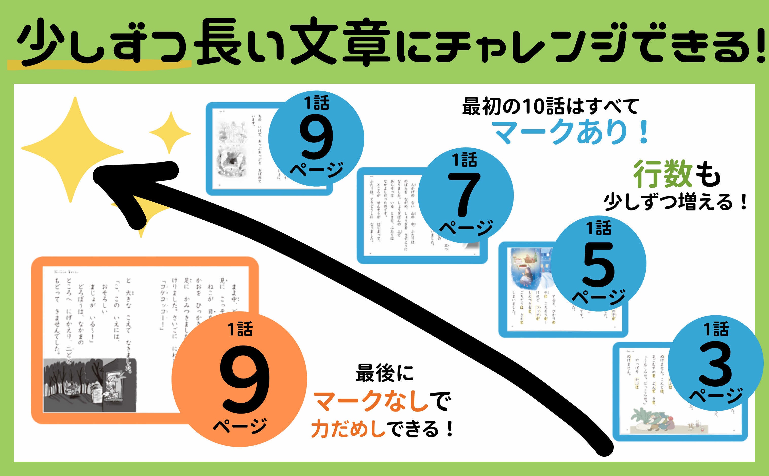 本の後ろに進むにつれ、文字は小さく、お話は長くなっていきます。「音読サポートマーク」がついていない11~12話は、どれだけ読めるようになったかの力試しにお使いください。
