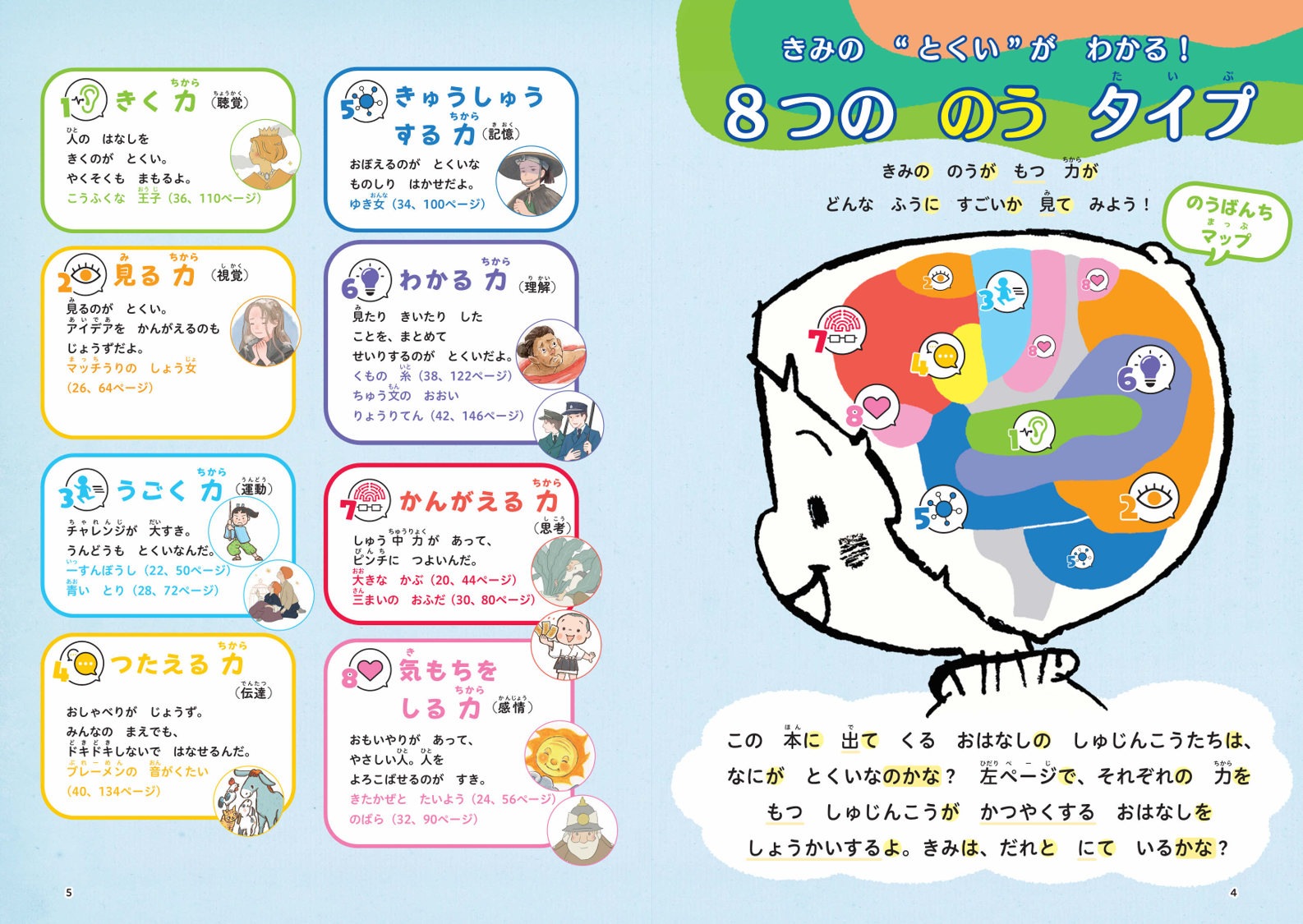 大きな かぶ(ロシアの むかしばなし)/一すんぼうし(日本の むかしばなし)/きたかぜと たいよう(イソップどうわ)/マッチうりの しょう女(アンデルセン)/青い とり(メーテルリンク)/三まいの おふだ(日本の むかしばなし)/のばら(小川未明)/ゆき女(小泉八雲)/こうふくな 王子(オスカー・ワイルド)/くもの 糸(芥川龍之介)/ブレーメンの 音がくたい(グリムきょうだい)/ちゅう文の おおい りょうりてん(宮沢賢治)