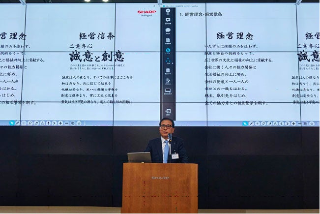 ・1つ目は「経営理念・経営信条」。この二つを大切にしてこそ、数々の世界初・日本初・業界初の製品・サービスを生み出してきた“シャープらしさ”を発揮できる。「経営理念・経営信条」に込められた精神を受け継ぎ、「誠意と創意」ある仕事に邁進してもらいたい。