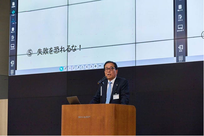 ・今日この場の緊張感や希望に満ちた思いをいつまでも忘れず、大きく成長してくれることを期待する。これから「強いブランド企業“SHARP”」をともに創り上げていこう。