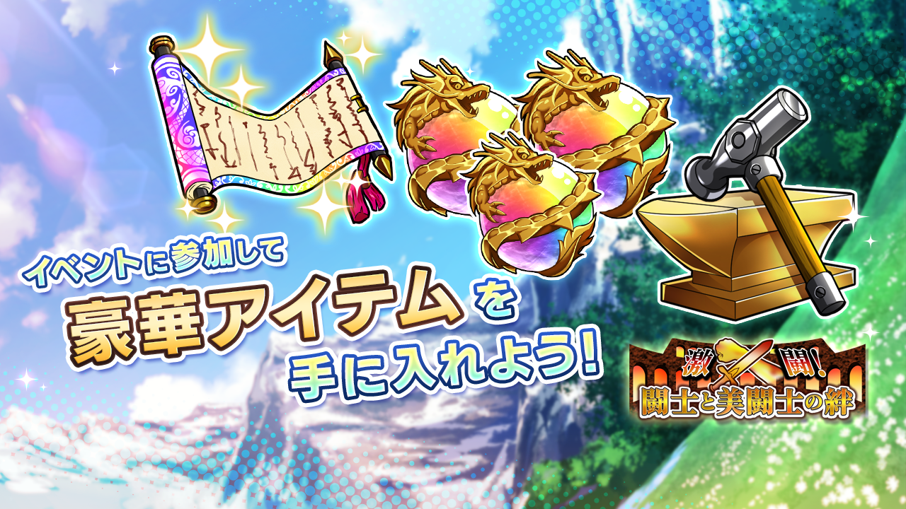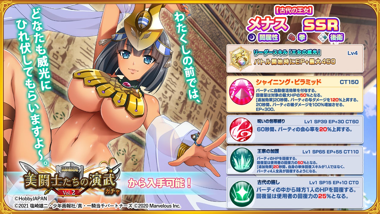 コラボ限定闘士「【流浪の戦士】レイナ(SSR)」「【古代の王女】メナス(SSR)」が他の同レアリティの闘士よりも高い確率で排出されます。