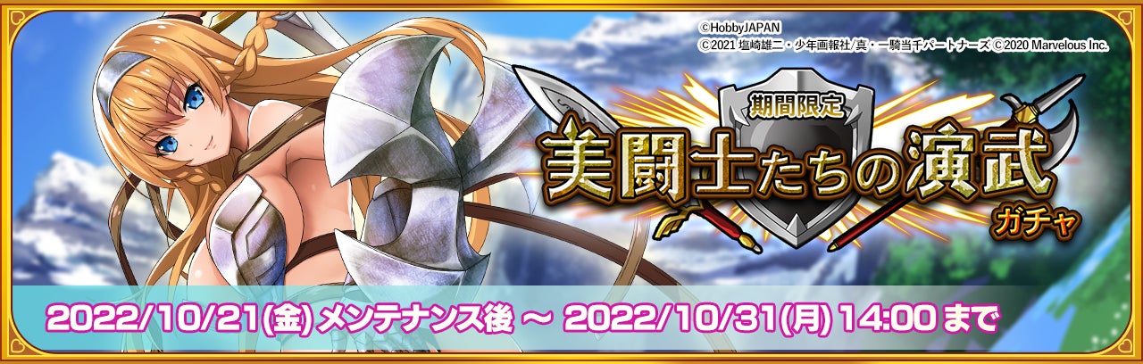 コラボ期間中、クイーンズブレイドUNLIMITEDコラボ記念「美闘士たちの演武ガチャ」が登場!