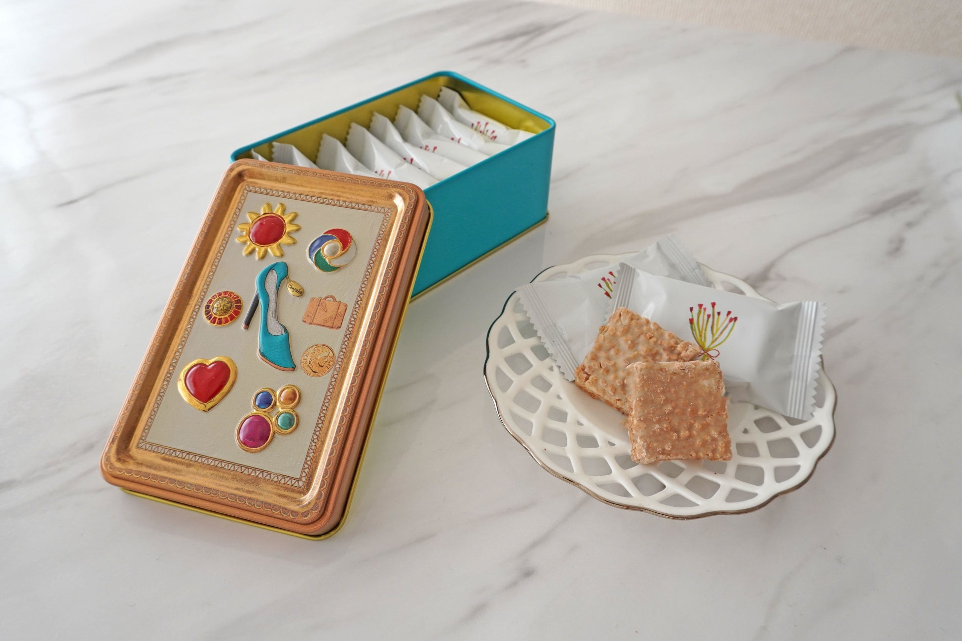宝石のようにキラキラ輝く世界のボタンが描かれたお菓子の缶の中には、低糖質ながら濃厚なアップルシナモンのチョコクランチが8個入です。