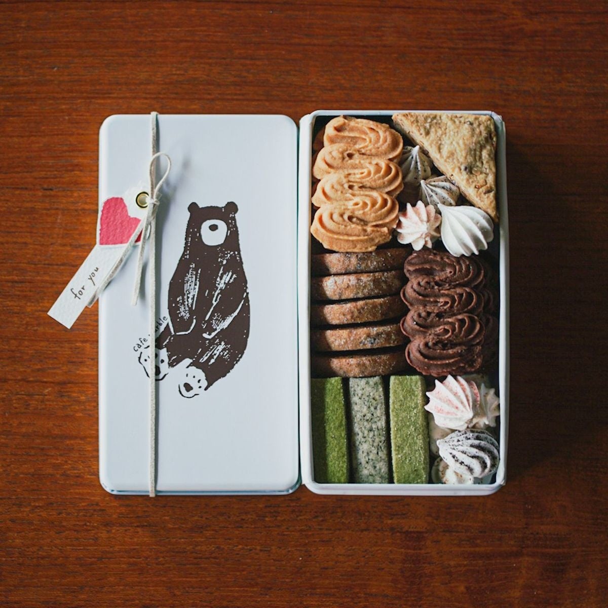 クマさんを描いたオリジナル缶はシンプルながらも愛らしいデザイン。