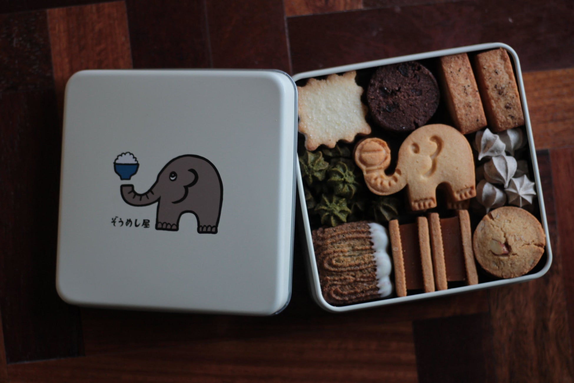 ぞうめしクッキーを始め、甘いもの、バター豊かなもの、お茶が香るもの、珈琲やお茶と相性のいいクッキーを9種類詰め合わせました。