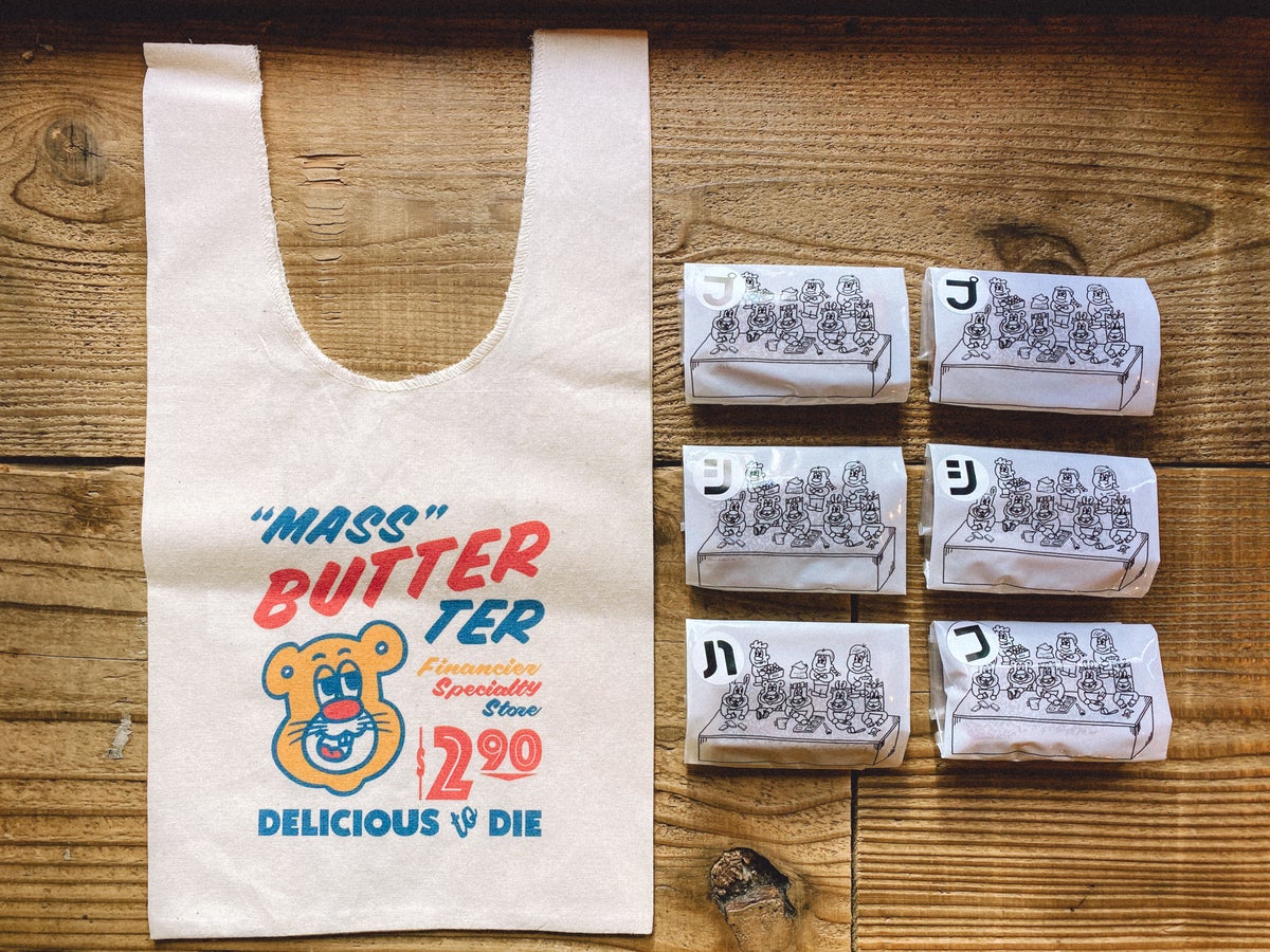 オリジナルデザインのマルシェバック、プレーン2個、塩2個発酵バター1個、コニャック1個が入ったセット。