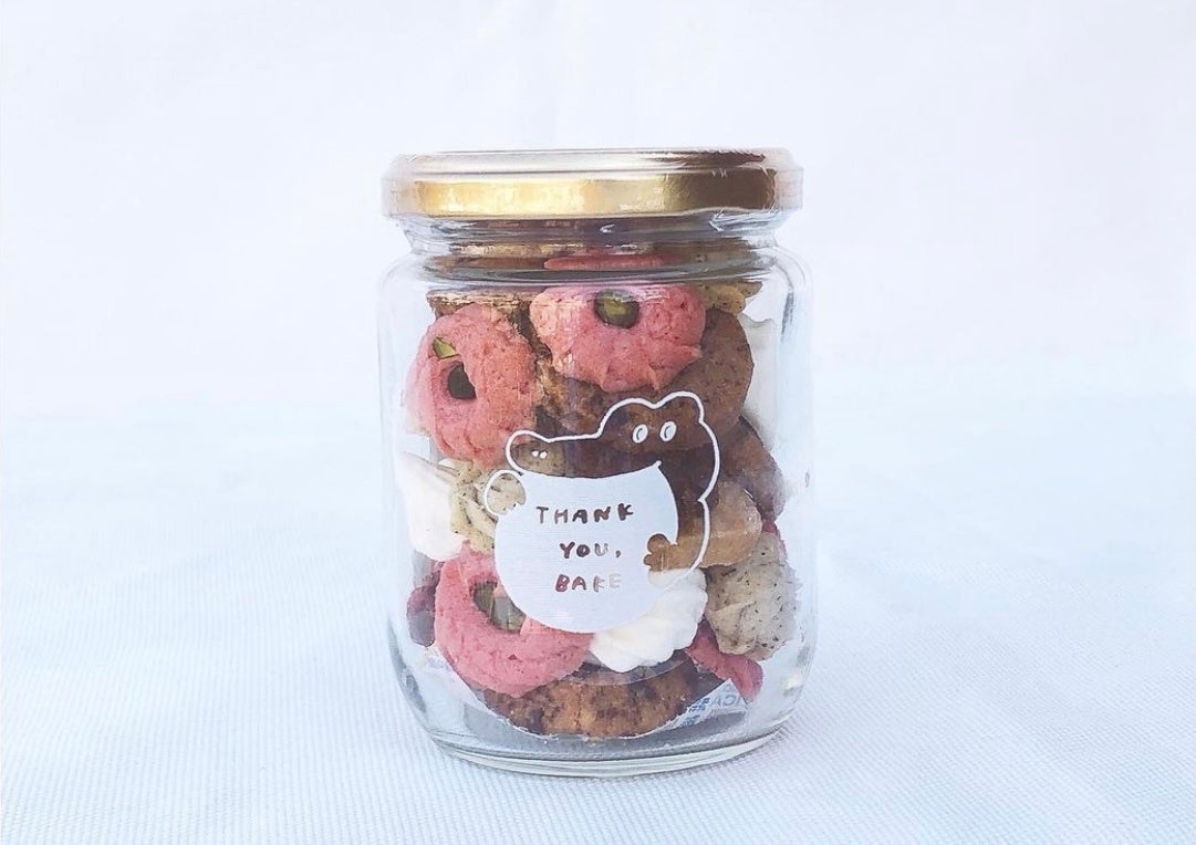 ワニさんの瓶に6種類の色とりどりのクッキーがぎっしりと詰まっています。