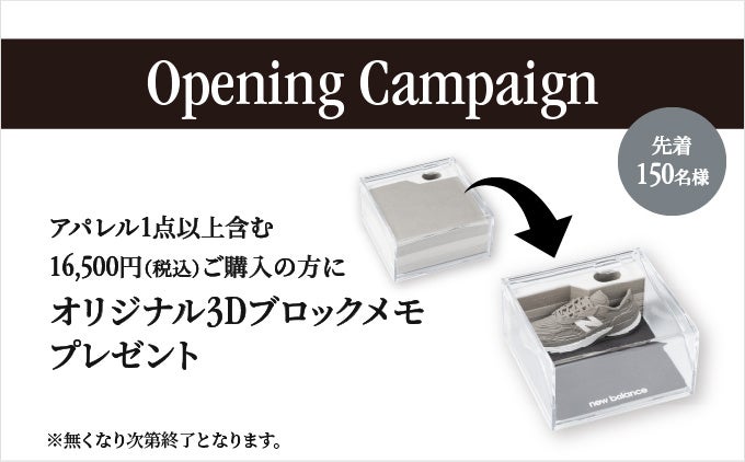 リニューアルオープンを記念し、キャンペーンをご用意しています。店内アパレル1点以上を含む16,500円(税込)以上ご購入の先着150名様に、オリジナルの3Dブロックメモをプレゼントいたします。
