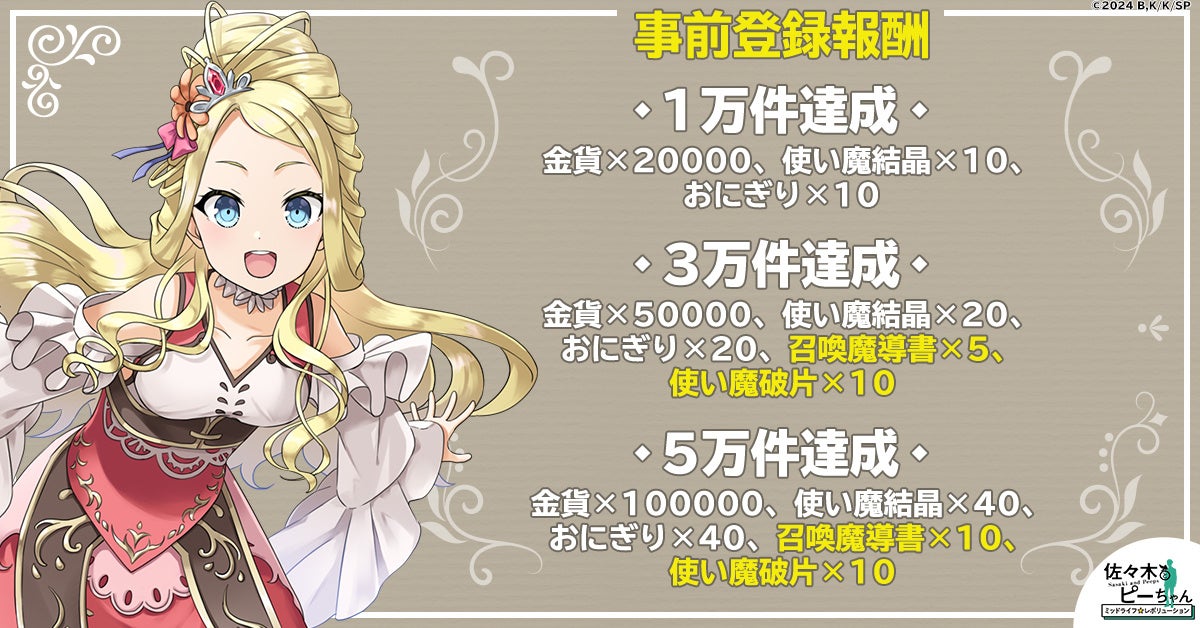 事前登録の参加件数に応じて、サービス開始時に豪華アイテムを全員にプレゼントいたします。事前登録件数が5万件達成で、15連分のガチャアイテムや、ランダムな使い魔1体を合成できるアイテムなど豪華報酬が手に入ります。ぜひ事前登録をお願いいたします。
