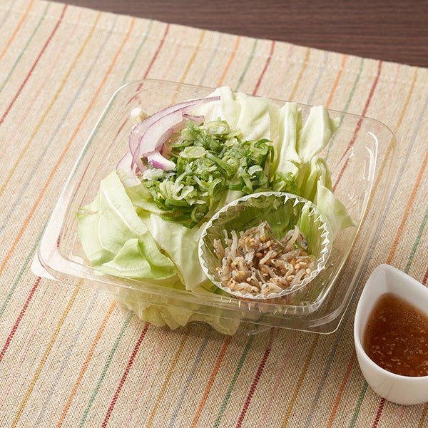 【内容】ざく切りキャベツに、ごま油で炒めたじゃこや青ねぎ・紫玉ねぎを合わせたおつまみサラダです。にんにくとごま油の風味がきいた旨だれ付きです。
