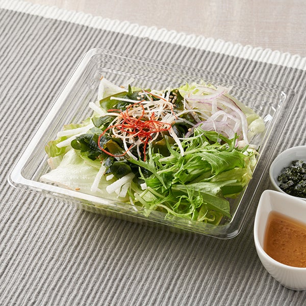 【内容】レタスのシャキシャキ食感が味わえるサラダです。わかめや水菜、白髪ねぎなどをトッピングしました。胡麻香るうま塩ドレッシングときざみ海苔付きです。