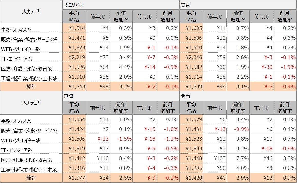 エリア別の平均時給について、関東エリアは1,639円(前年比49円増、前月比6円減)、東海エリアは1,377円(前年比34円増、前月比3円減)、関西エリアは1,420円(前年比40円増、前月比12円増)となりました。