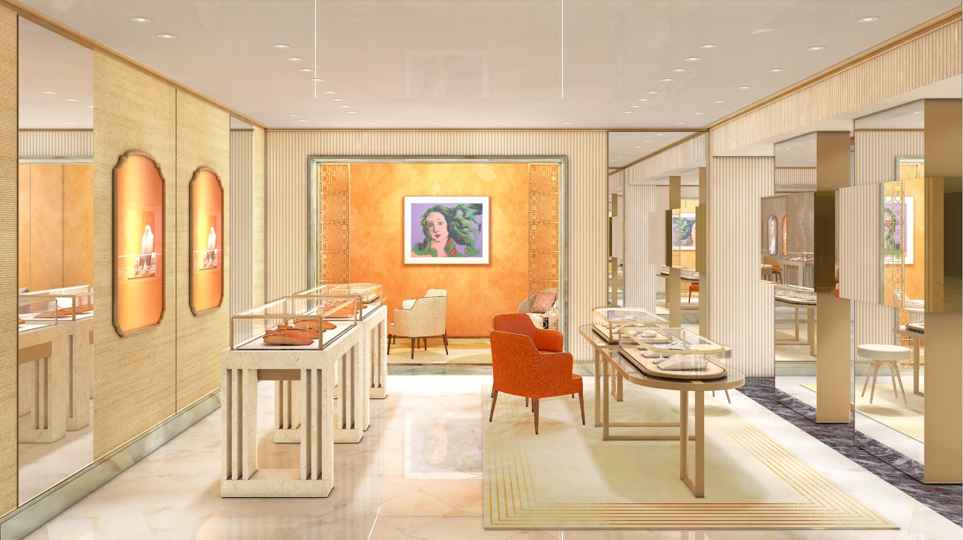 焦点となるトラバーチン製のエレガントな楕円形のカウンターには、イタリアの職人技を想起させる彫刻がほどこされています。またゆったりとお買い物を楽しまれるお客様のために、職人技が光るゴールドカラーの漆喰で仕上げられたプライベートセールスルームもあり、パンテオンにインスパイアされたメッシュデザインのパネルドアがエレガントな印象を与えます。 また店内には、「僕にとって、ブルガリの店に行くのは最高のコンテンポラリーアート展に行くようなもの」という有名な言葉を残した、アイコニックなポップアートの巨匠アンディ・ウォーホルの色彩豊かなアート作品を展示しています。