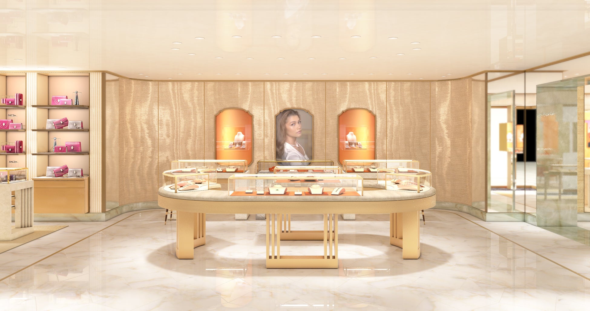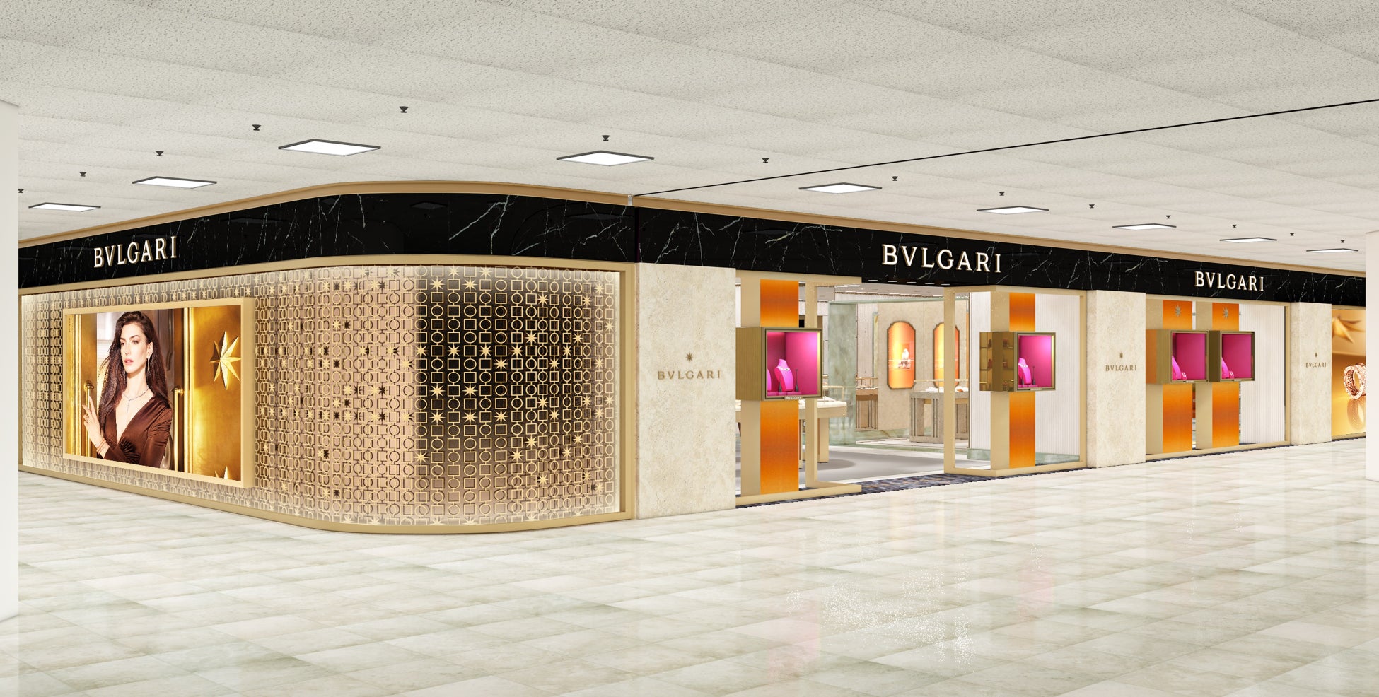 エントランスはブランドブルガリのアイコンであるBVLGARIのロゴをあしらった、光沢のある黒の大理石を使用したエレガントな趣きです。4つの大きなショーウィンドーのバックパネルはシーズナブルに変容し、クリエイティブでブルガリ独自のスタイルで様々なテーマを探求するアーティスティックなストーリーテリングを表現しています。側面のファサードには、ローマで最も古くそして保存状態の良いモニュメントのひとつであるパンテオンにインスパイアされた、芸術的なゴールドカラーのメッシュのパネルで装飾が施されたヴィジュアルが目を惹きます。このデザインにはパンテオンの床と同じ幾何学模様がほどこされており、ブルガリのラッキーアイコンであるエイトポイントスターが組み込まれています。