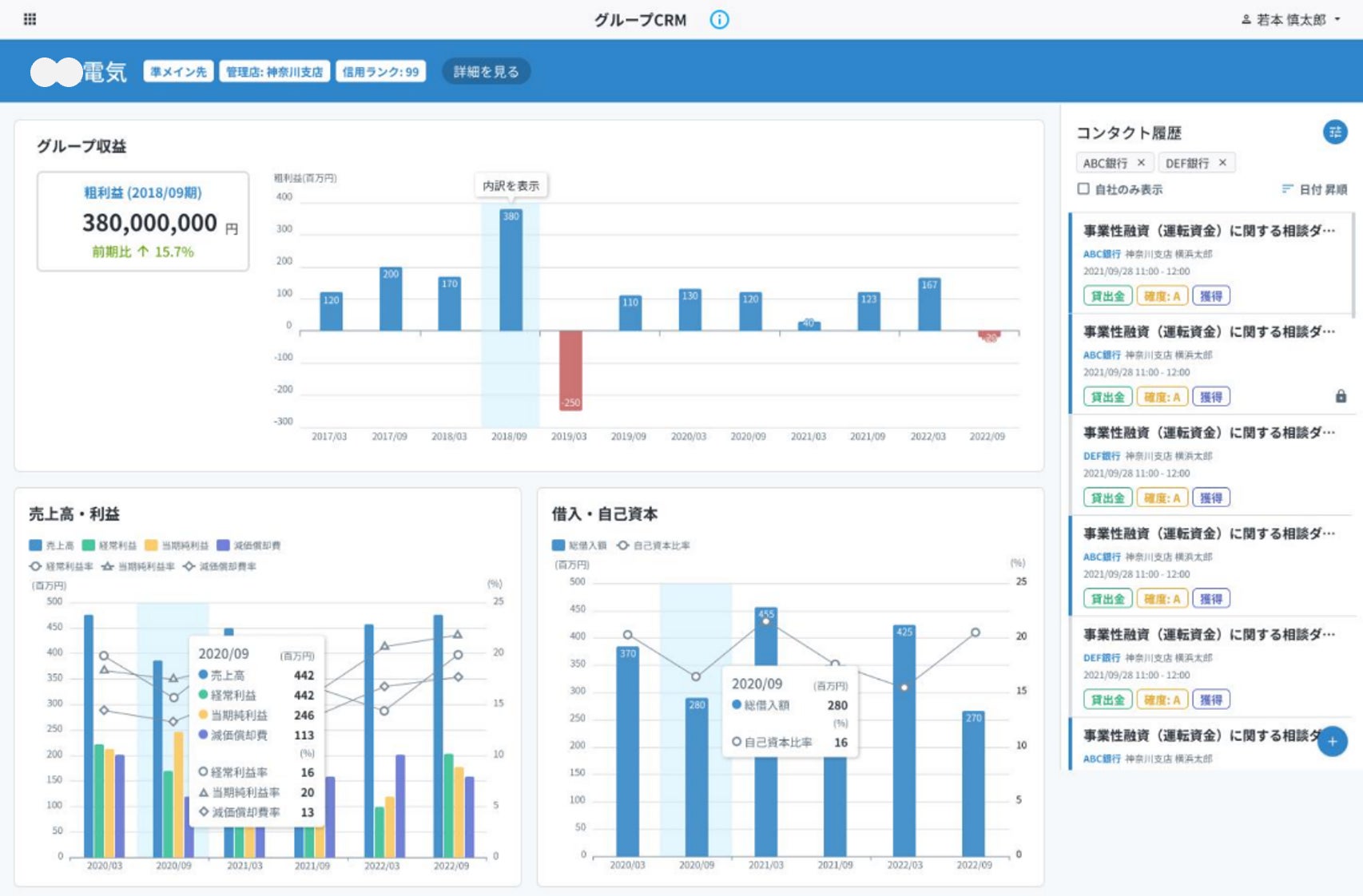 多様なデータ連携手段(ファイル連携、API連携など)に対応可能です。既存のCRMサービスやグループ各社のシステムなどから連携するデータを蓄積することで、顧客の事業に関する情報やグループ収益などグループ全体で保有している顧客情報を、総合的に時系列で可視化することができます。