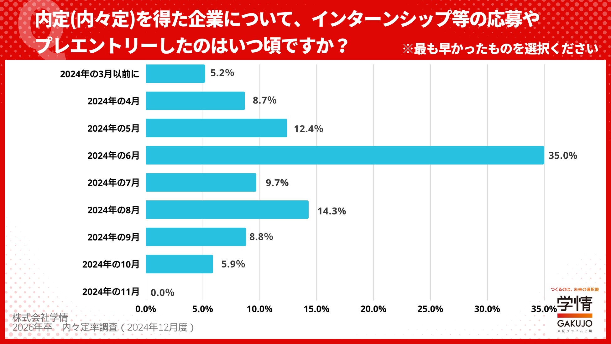 内々定を得た企業と接点をもった時期は「2024年6月」が35.0%と、大きく他を引き離して最多となりました。次いで「2024年8月」14.3%、「2024年5月」12.4%と続いています。また、内々定を得た企業と2024年6月までに接点をもった学生が61.3%で、6割を超えました。