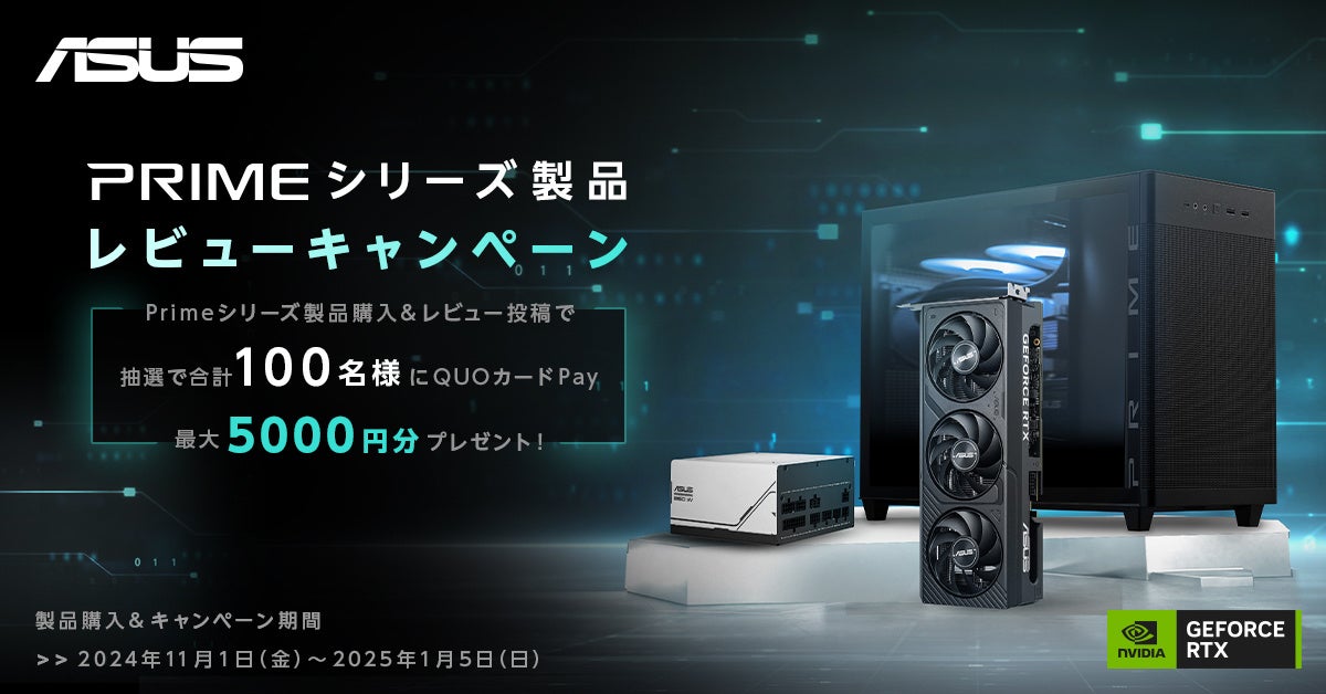 ASUS JAPAN株式会社は、Primeシリーズ製品を購入&レビュー投稿で抽選で合計100名様に、最大QUOカードPay5000円分が当たるキャンペーンを2024年11月1日(金)より開催します。
