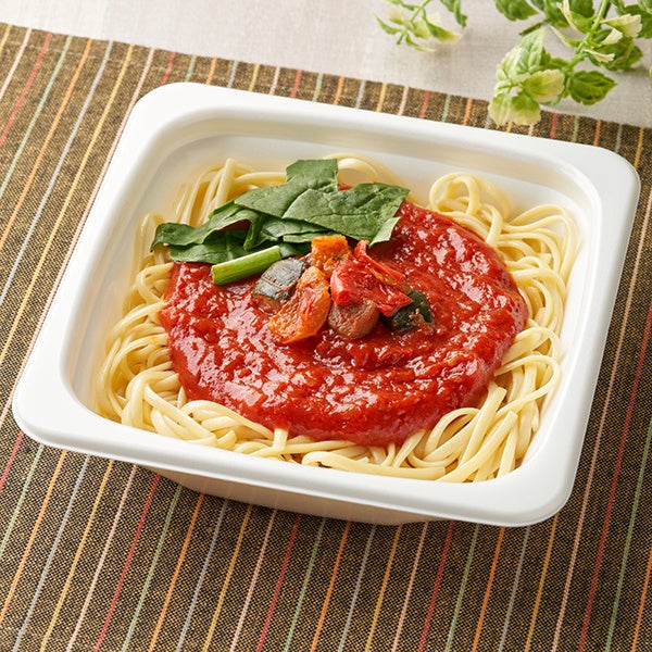 【内容】トマトのソースに唐辛子などのキレのある辛味とにんにくや豚の旨味が感じられるアラビアータです。4種のグリル野菜とほうれん草をトッピングしています。麺はソースと相性の良いリングイネを使用しています。