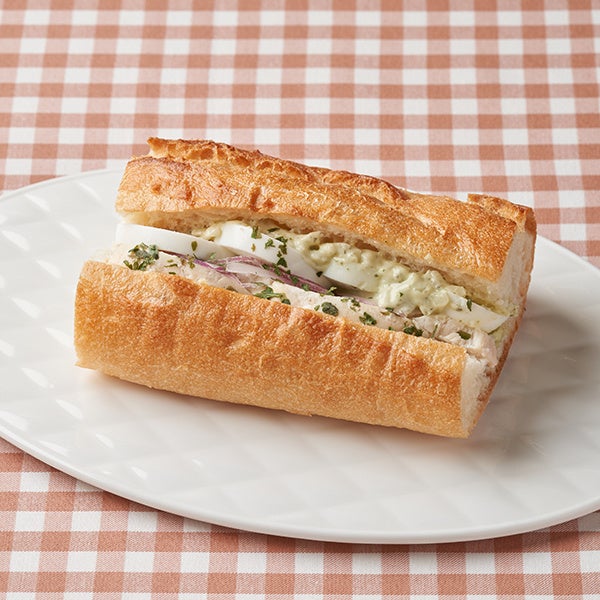 【内容】チキン、ゆでたまご、バジルソース、 紫玉ねぎを合わせた石窯パリジャンサンドです。バジルソースは、バジルペーストに、卵黄を使用したマヨソースで仕立て、隠し味にマスタードを少量加えました。