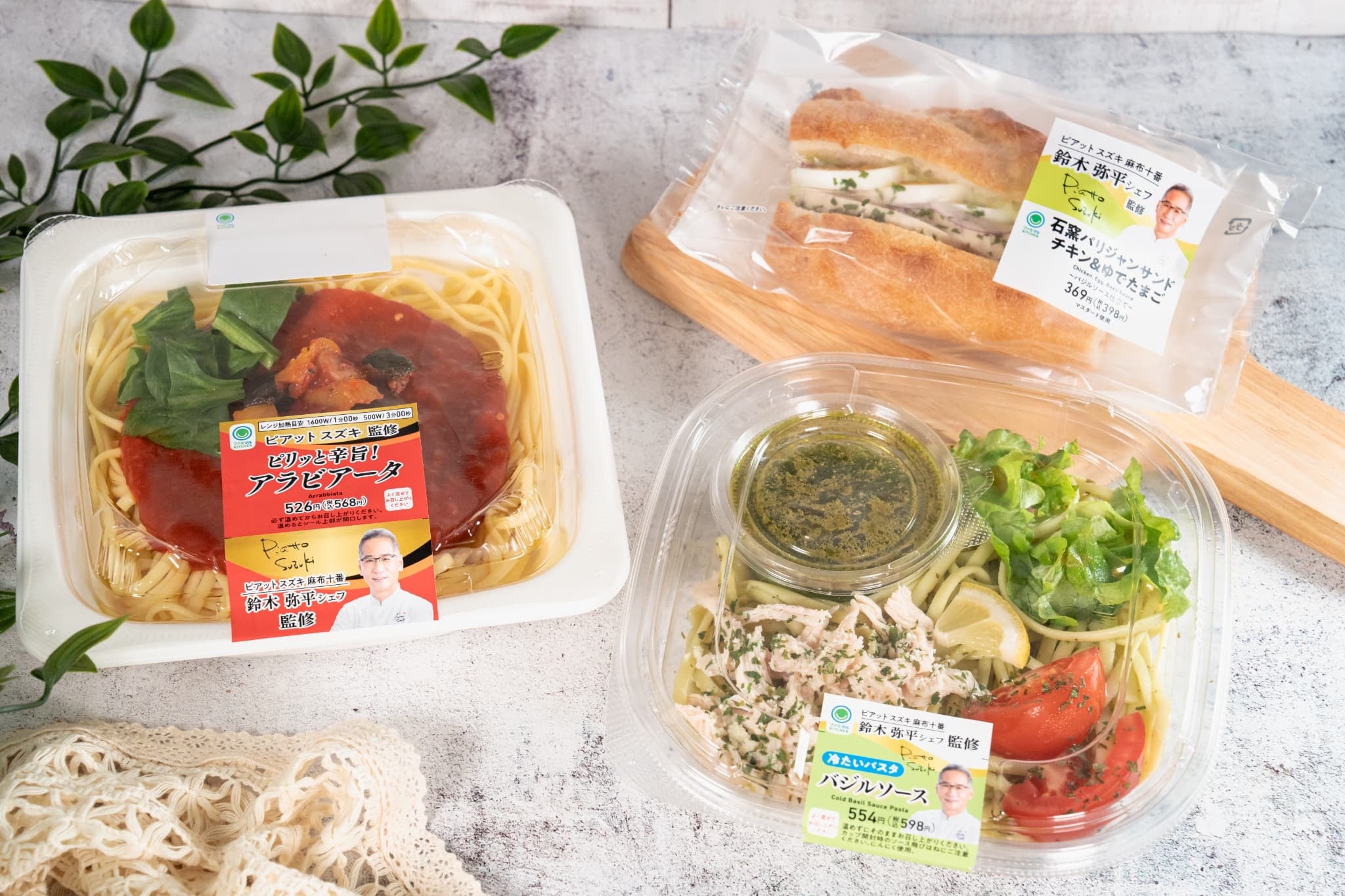 このたび、ファミリーマートでは初となる「ピアット スズキ」オーナー鈴木シェフ監修の「ピリッと辛旨!アラビアータ」、「冷たいパスタ バジルソース」、「石窯パリジャンサンド チキン&ゆでたまご~バジルソース仕立て~」を発売いたします。キレのある辛みとトマトの酸味を感じられる旨辛なアラビアータをはじめ、冷製パスタなど、夏の暑さを乗り切るのにピッタリな商品です。この機会にぜひご賞味ください。