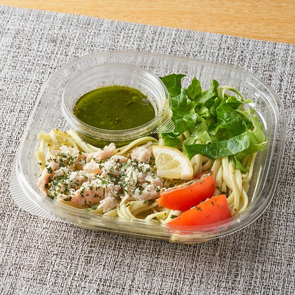 【内容】チーズ、松の実、にんにくを効かせた、香り高いバジルソースの冷たいパスタです。蒸し鶏、トマト、リーフレタス、パルメザンチーズ、パセリ、レモン等をトッピングしました。