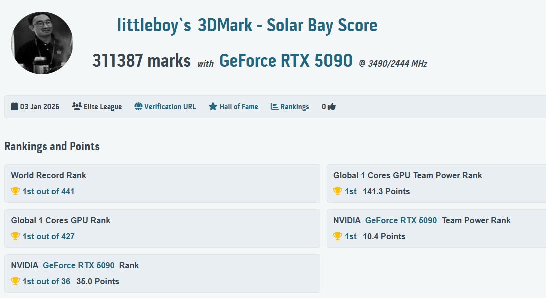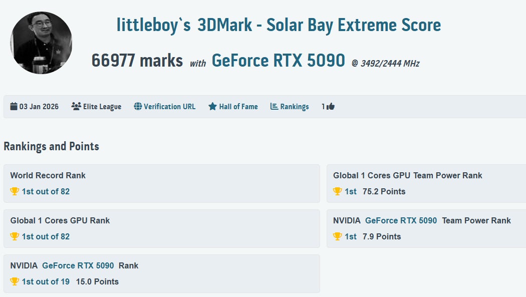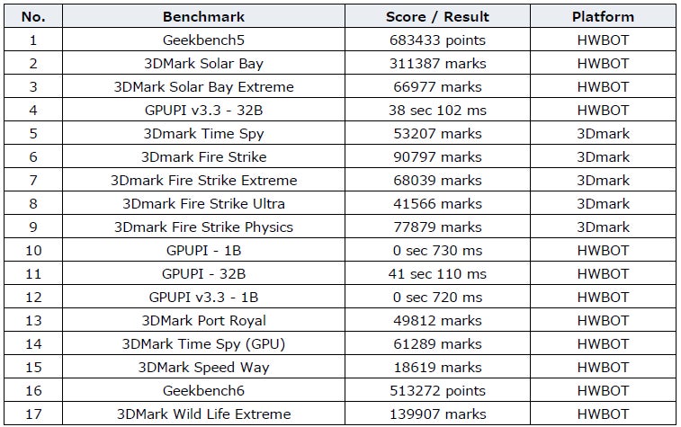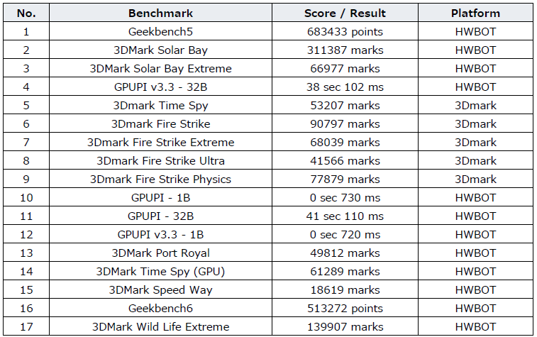 MSIの妥協なきハードウェア設計と極限のオーバークロック設計によって作られた GeForce RTX 5090 LIGHTNING は、17 のオーバークロックベンチマークで首位を獲得し、HWBOT や 3DMark において数多くの記録を更新しました。詳細は以下のチャートに示されています。