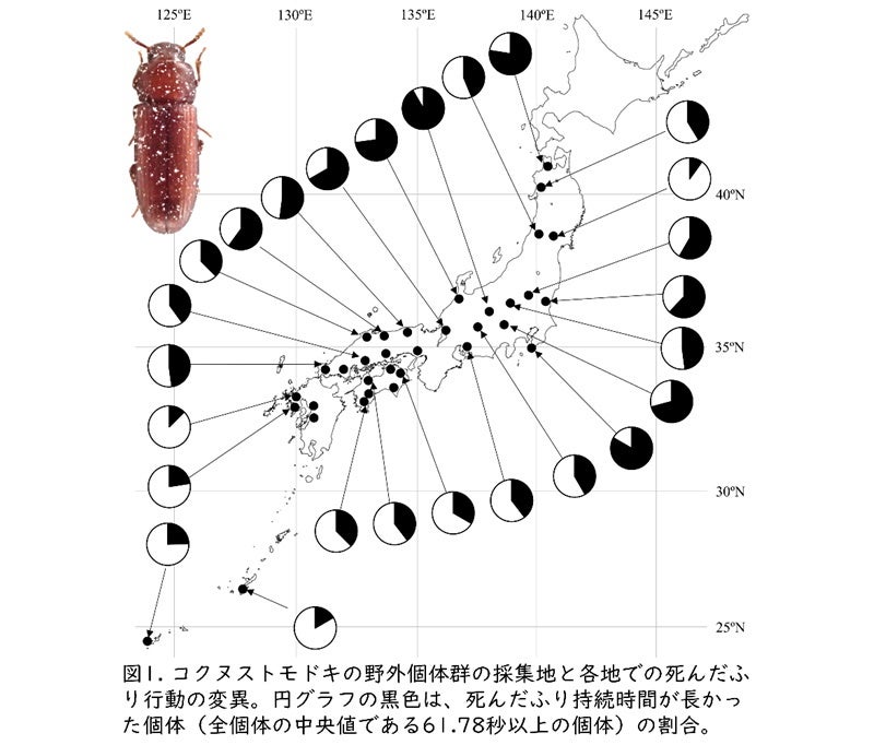 - 本研究では、日本各地に設置されているコイン精米機から採集されたコクヌストモドキを用いて、採集地の緯度と死んだふりの関係を調査したところ、高緯度(北)の個体は低緯度(南)の個体よりも、死んだふりを高頻度で長い時間行うことが明らかになりました。