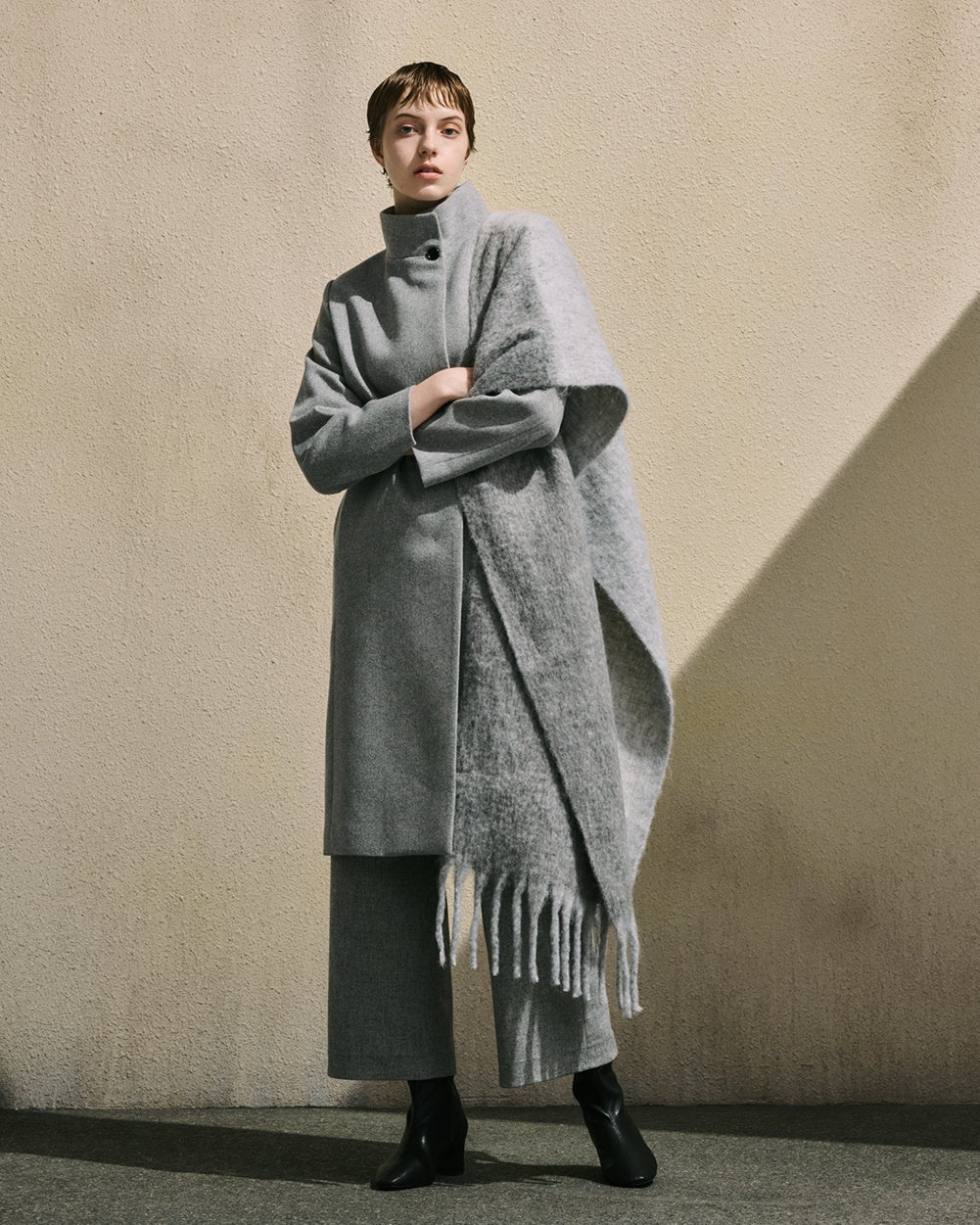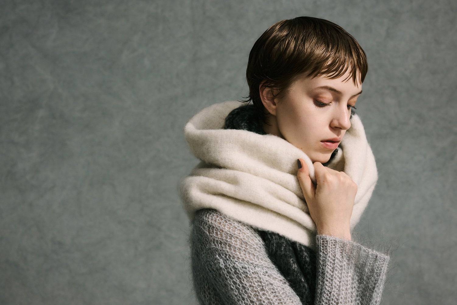 冬のLOOKBOOKでは、柔らかく暖かみのあるフォックス混の風合いが魅力のカーディガンや、Iラインで細身ながらもローゲージニットやジャケットにも羽織れるゆとりを持たせたスタンドカラーコート、コーディネートに暖かみと奥行を加えるバイカラーストールなどを展開しています。