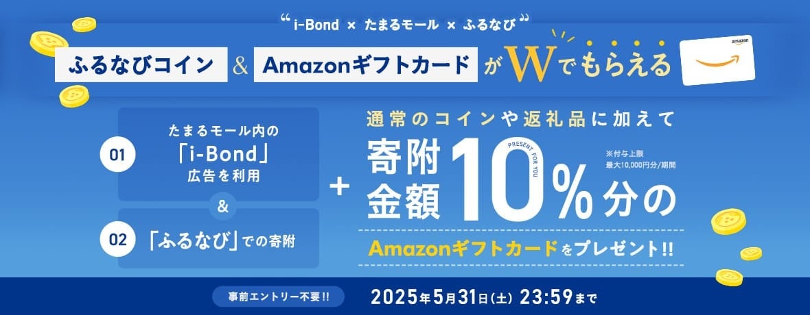【5/31まで】「たまるモールbyふるなび」にて『i-Bond』広告を利用&ふるなびからの寄附で、ふるなびコインとAmazonギフトカード(最大10,000円分まで)がWでもらえるキャンペーン実施中!