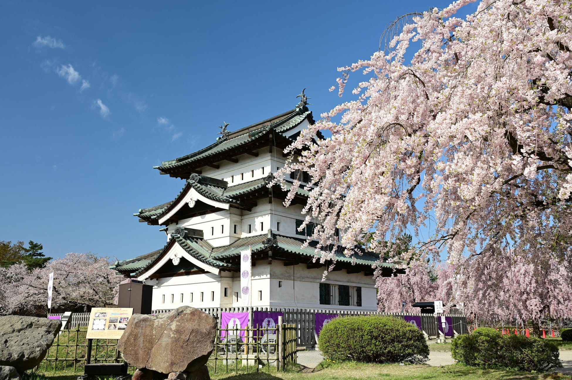 ◆「弘前さくらまつり」へのお出かけに便利な列車を運転します。石垣修理に伴い曳家された天守と桜のコラボは、今年が見納めとなります。昨年よりも本数を増やした弘前さくらまつり号で、曳家さ