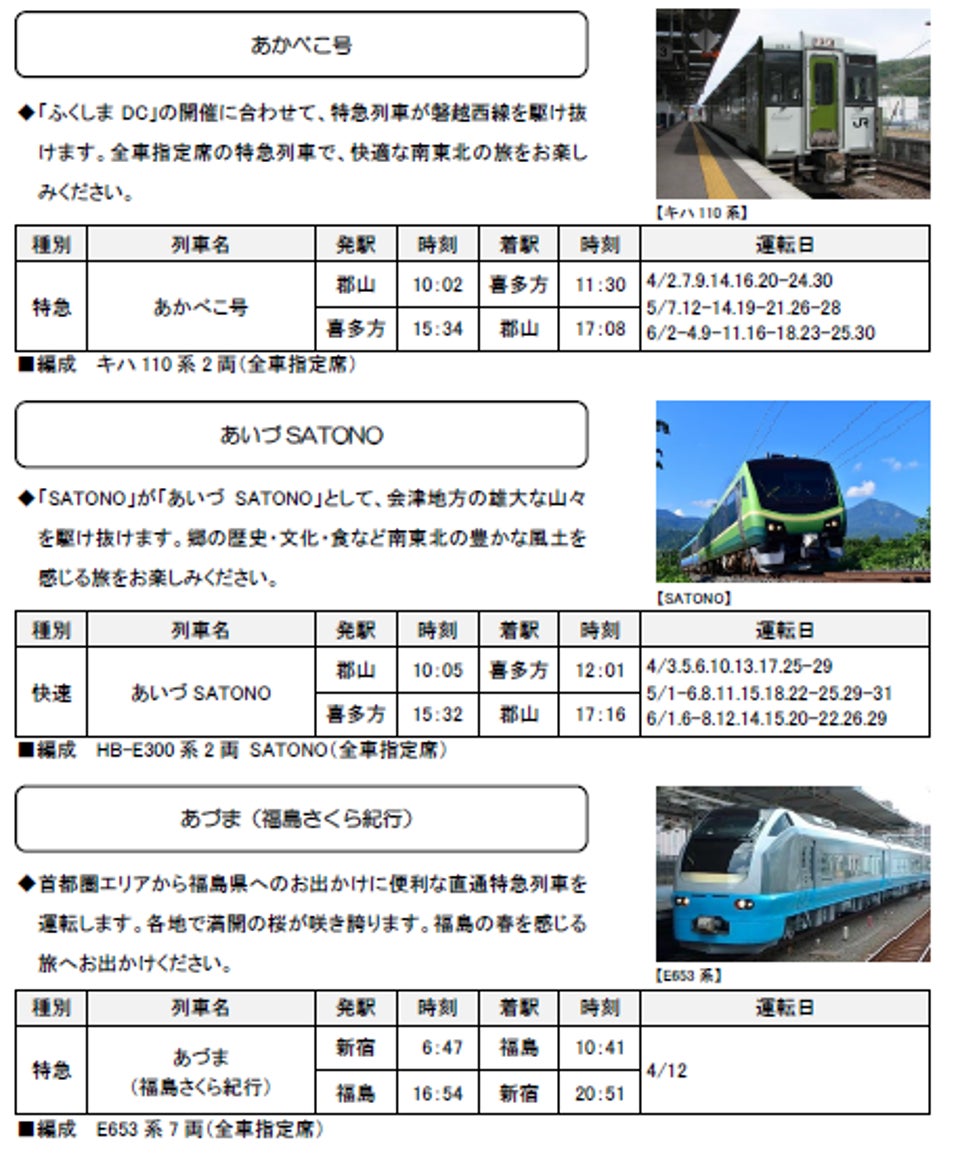 2026年3月1日(日)~6月30日(火)の期間に、各地で春のイベントやお花見などへのお出かけに便利な列車を運転します。また、2026年4月1日(水)~6月30日(火)の期間に開催される「ふくしまデスティネーションキャンペーン」(以下、ふくしま DC)に合わせて臨時列車を多数運転するほか、ゴールデンウィーク期間を中心に、首都圏と各地を結ぶ新幹線・特急列車を増発します。