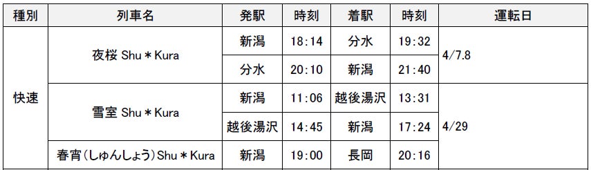 ◆春限定の臨時列車「夜桜Shu*Kura」、「雪室Shu*Kura」、「春宵(しゅんしょう)Shu*Kura」を運転します。「越乃Shu*Kura」とは違った区間での新潟の「酒」と「食」をお楽しみください。