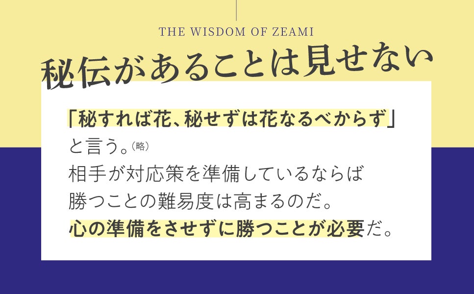 「秘すれば花、秘せずは花なるべからず」と言います。相手が対応策を準備しているならば、勝つことの難易度は高まります。心の準備をさせずに勝つことが必要です。
