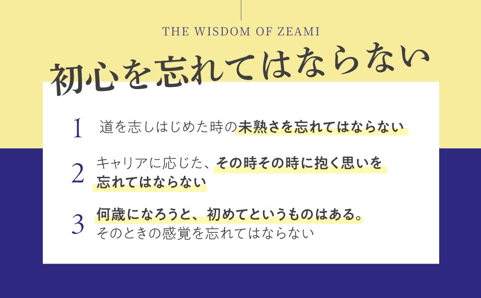 「初心忘るべからず」という言葉を一度は耳にしたことがあるでしょう。しかし、この名言が室町時代の能楽師、世阿弥の言葉であることを知っている人は少ないのではないでしょうか? さらに、「初心」は若い新人だけのものではなく、それぞれの年齢に応じた初心があると世阿弥が説いていることも、あまり知られていません。